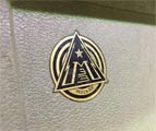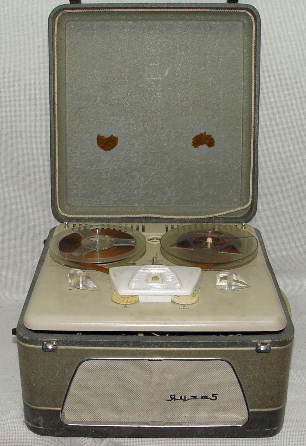 с внутренней стороны крышки закрывающий магнитофон приклеен латунный шильдик
