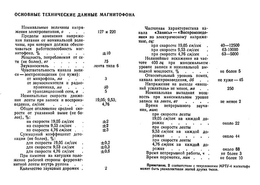 размеры и вес аппарата. Магнитофон двухдорожечный и рассчитан на использование
