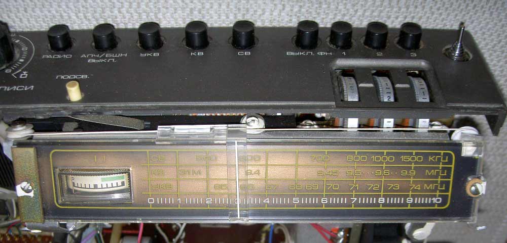 Диапазоны: СВ - 571,4...186,9 м. KB - 31,6...30,6 м. УКВ - 4,56...4,11