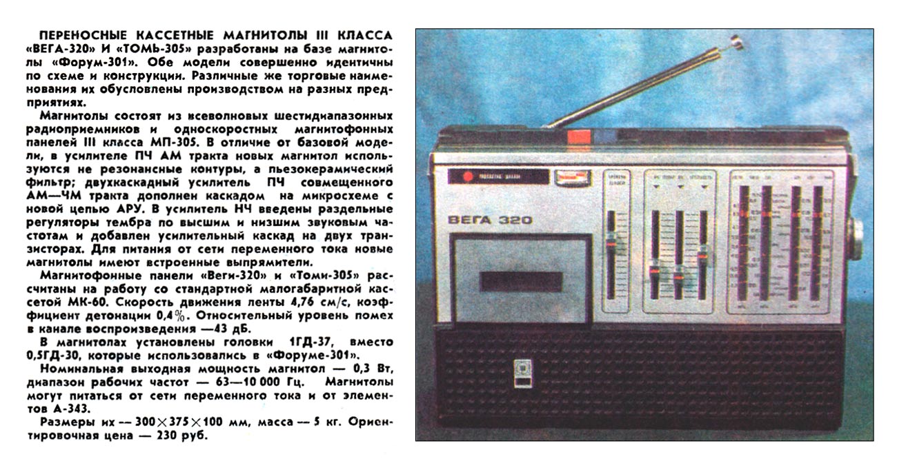 магнитолы "Вега-320" и "Томь-305" с 1976 и 1977 года соответственно выпускали