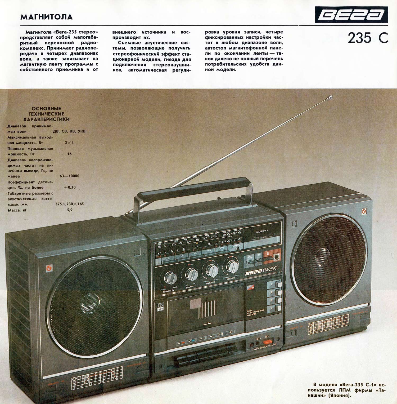 ЛПМ фирмы Танашин, Япония. Небольшая партия магнитол "Вега РМ-235С" была
