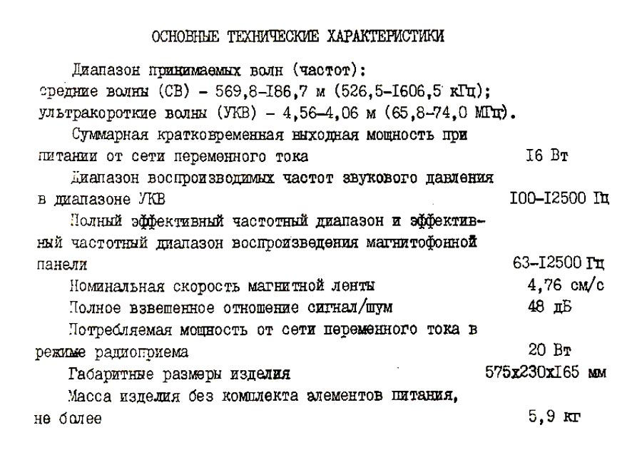 включает в себя радиоприёмник, магнитофонную панель, усилитель и две АС.