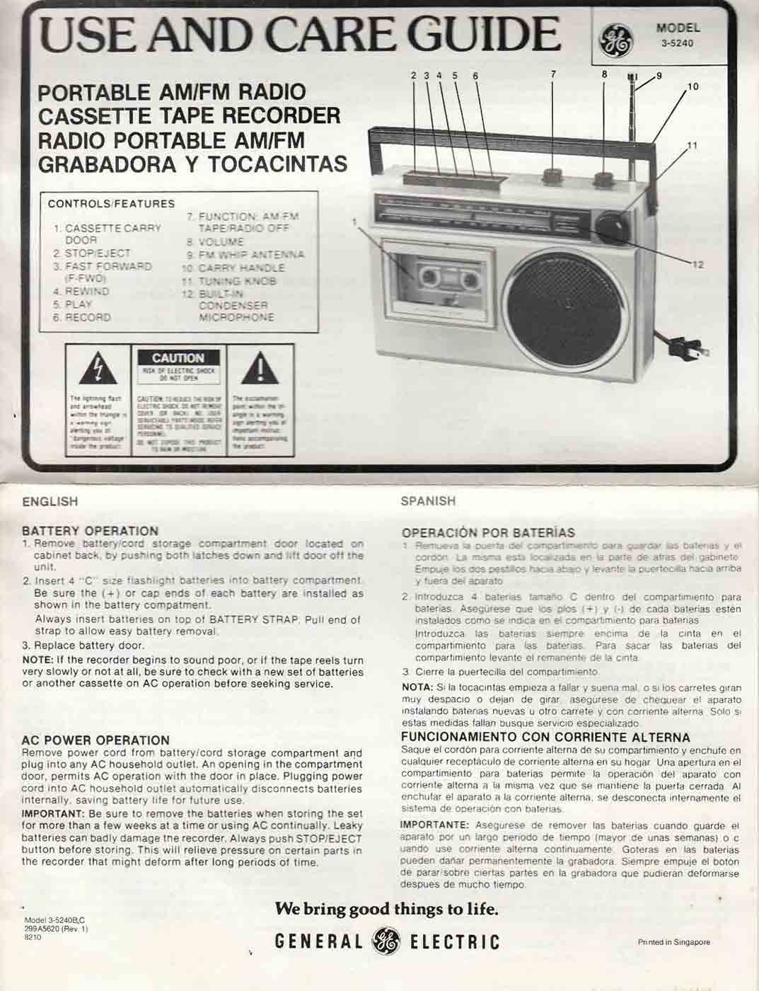 Портативная кассетная магнитола "General Electric 3-5240D" выпускалась возможно с 1983 года компанией "General Electric", США. По модели информации нет. На мой взгляд стандартная для тех лет магнитола.