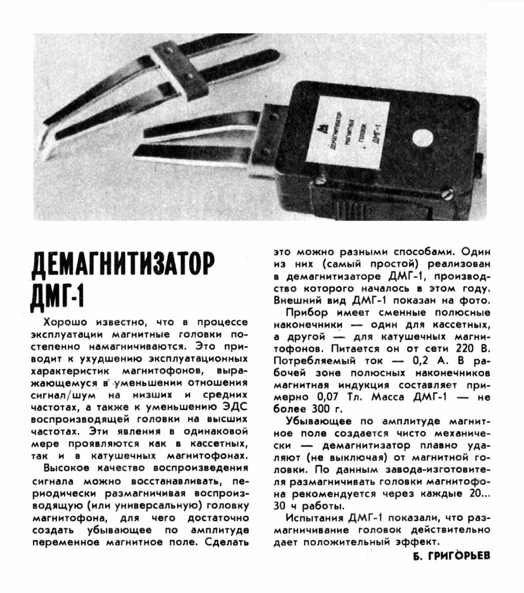 демагнитизатора "ДМГ-1" из журнала "Радио" № 4 за 1984 год.