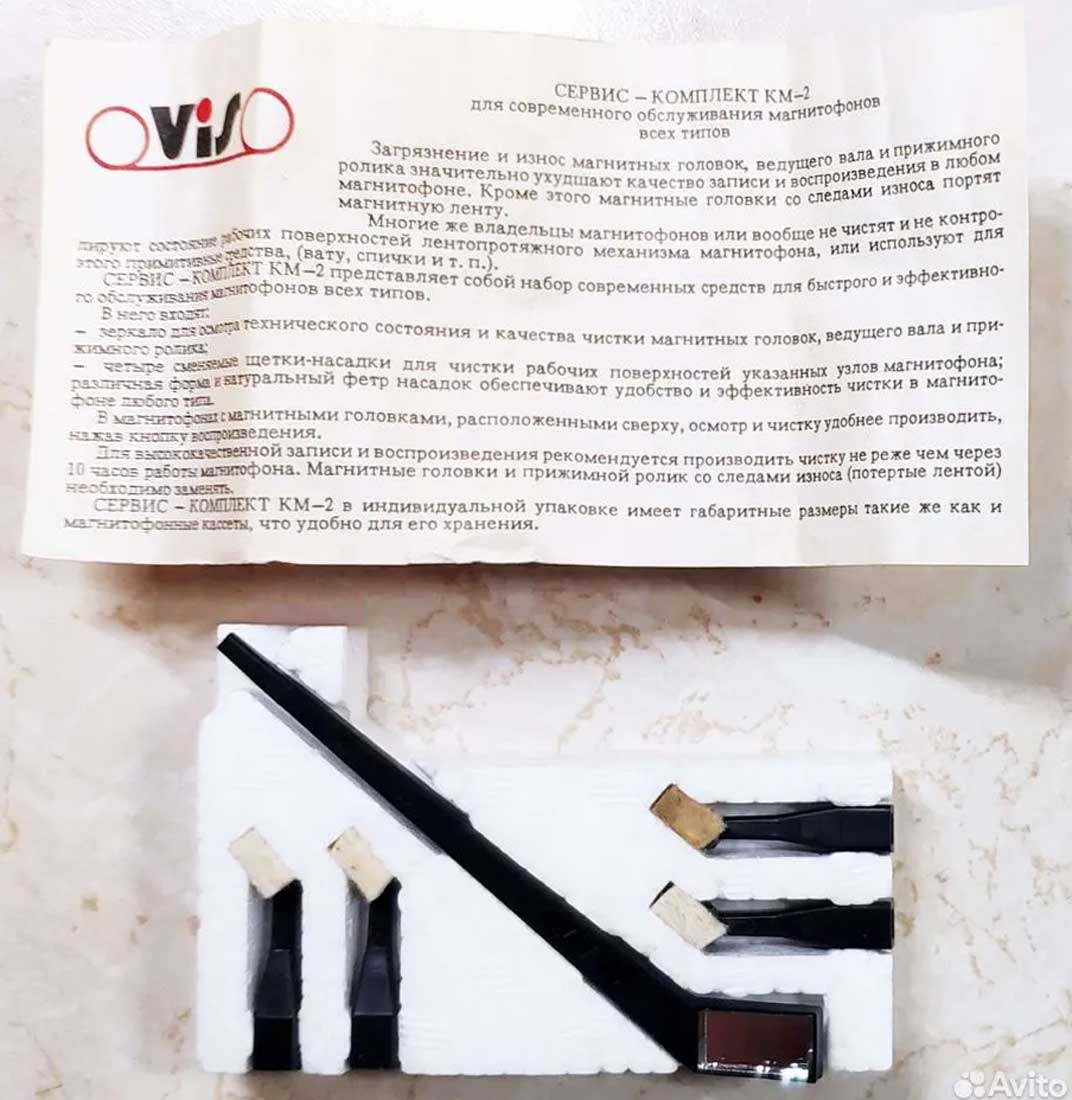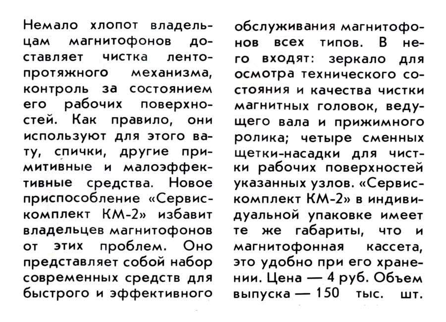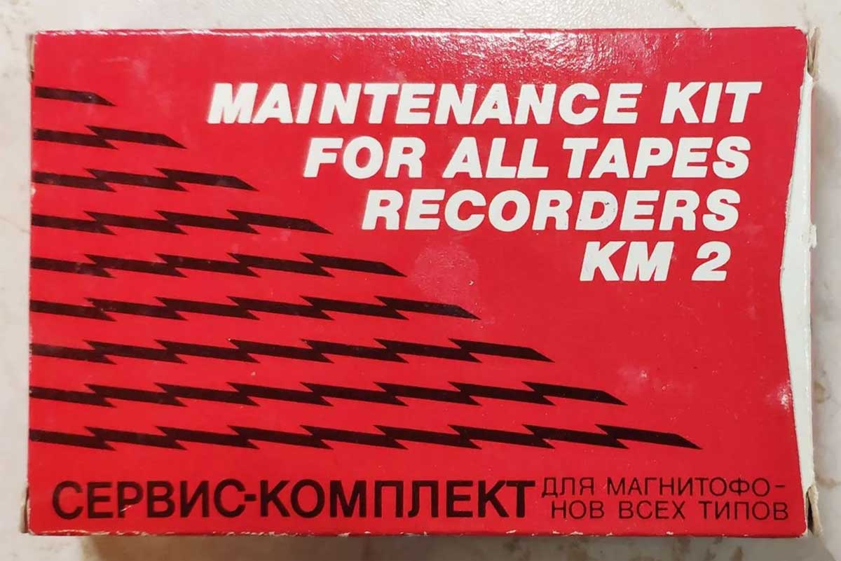 Сервис-комплект "КМ-2" выпускался с 1990 года. Предназначен для чистки прижимного ролика, ведущего вала и магнитных головок во всех типах кассетных и катушечных магнитофонов.