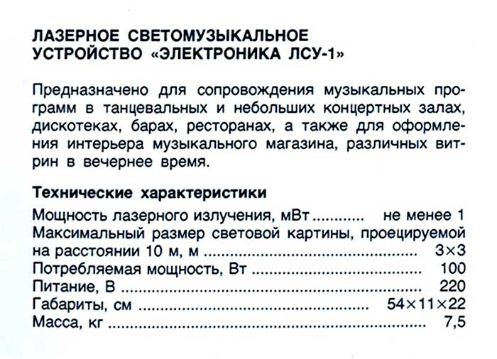 Лазерное светомузыкальное устройство "Электроника ЛСУ-1" выпускалось предположительно с 1986 года. Информация об устройстве только в рекламном проспекте.