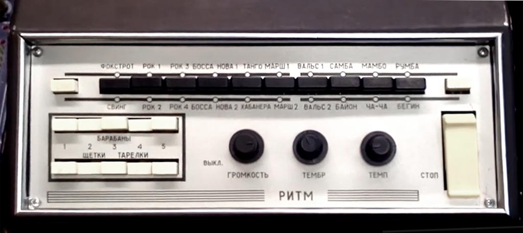 Электронная установка ударного аккомпанемента "Ритм" выпускалась предположительно с 1982 года Рижским опытным заводом гидрометприборов. Назначение в проспекте.