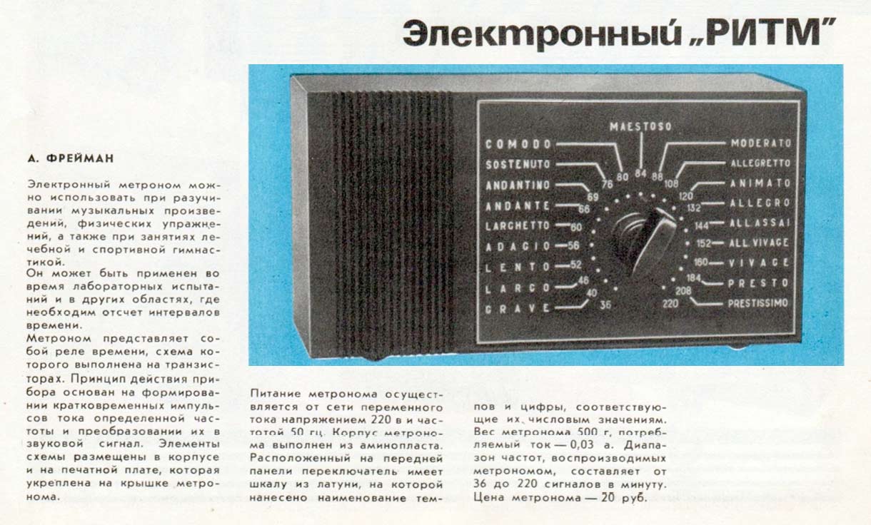 Метроном электронный "Ритм" выпускался с 1973 года неустановленным пока предприятием. Проспект из журнала "Новые товары" № 1 за 1973 год.