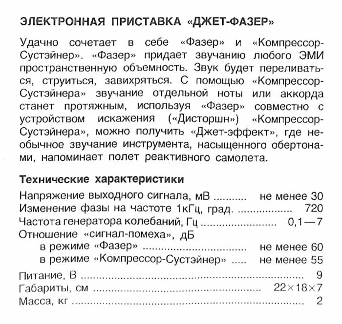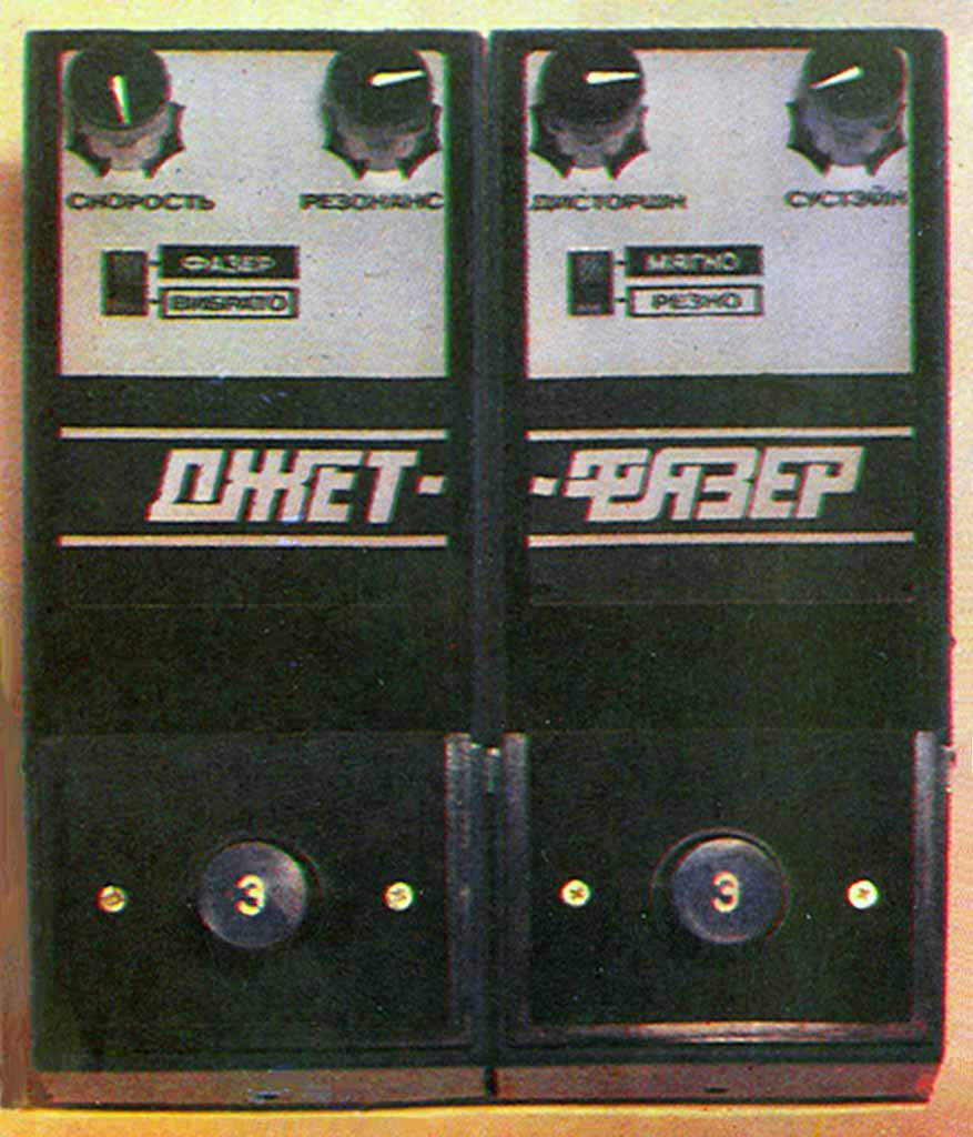 Электронная приставка "Джет-Фазер" производилась предположительно с 1982 года. Сочетает в себе эффект "Фазер" и "Компрессор-Сустэйнер", придавая звучанию любого ЭМИ пространственную объёмность.
