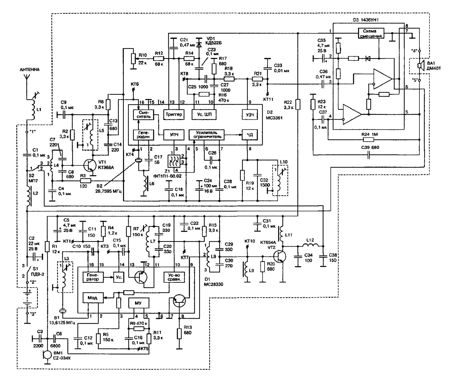 ТХ: Радиус действия 70 м; рабочая частота 27, 14 МГц; источник питания