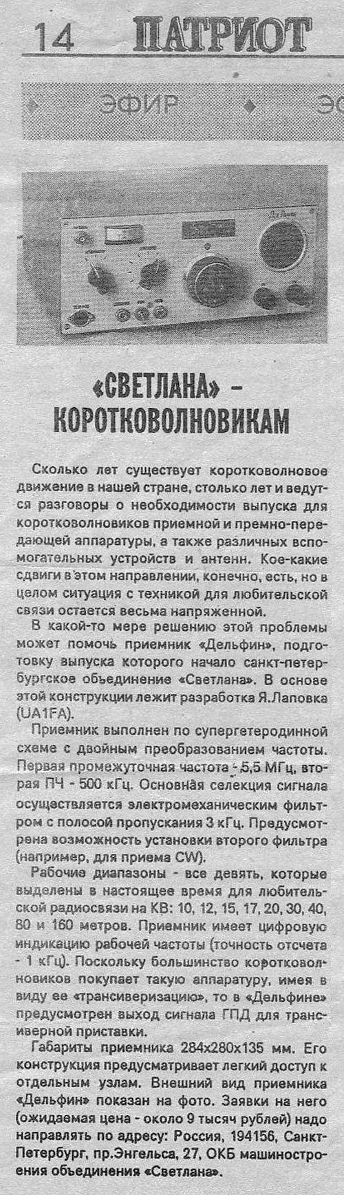 приёмник "Дельфин" выпускался с 1993 года объединением "Светлана" в Санкт-Петербурге.