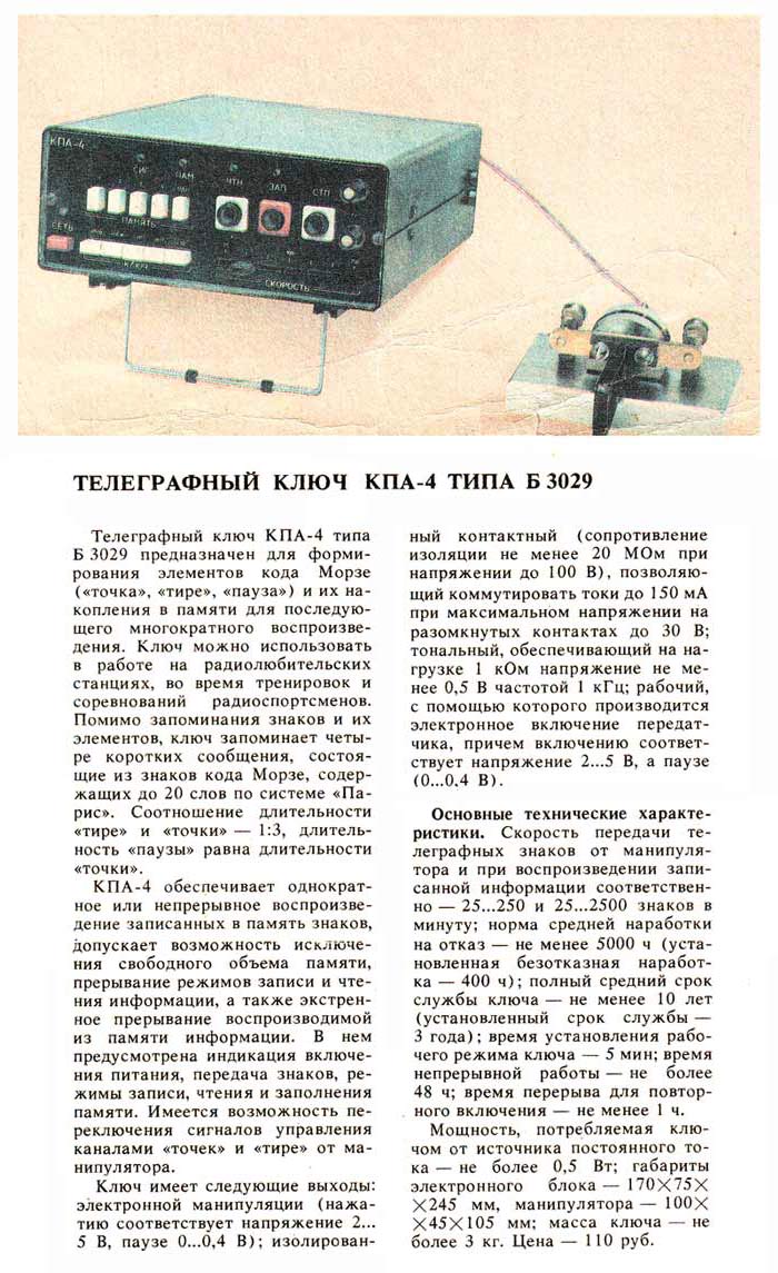 с 1990 года. Телеграфный ключ "КПА-4" типа Б 3029 предназначен для формирования