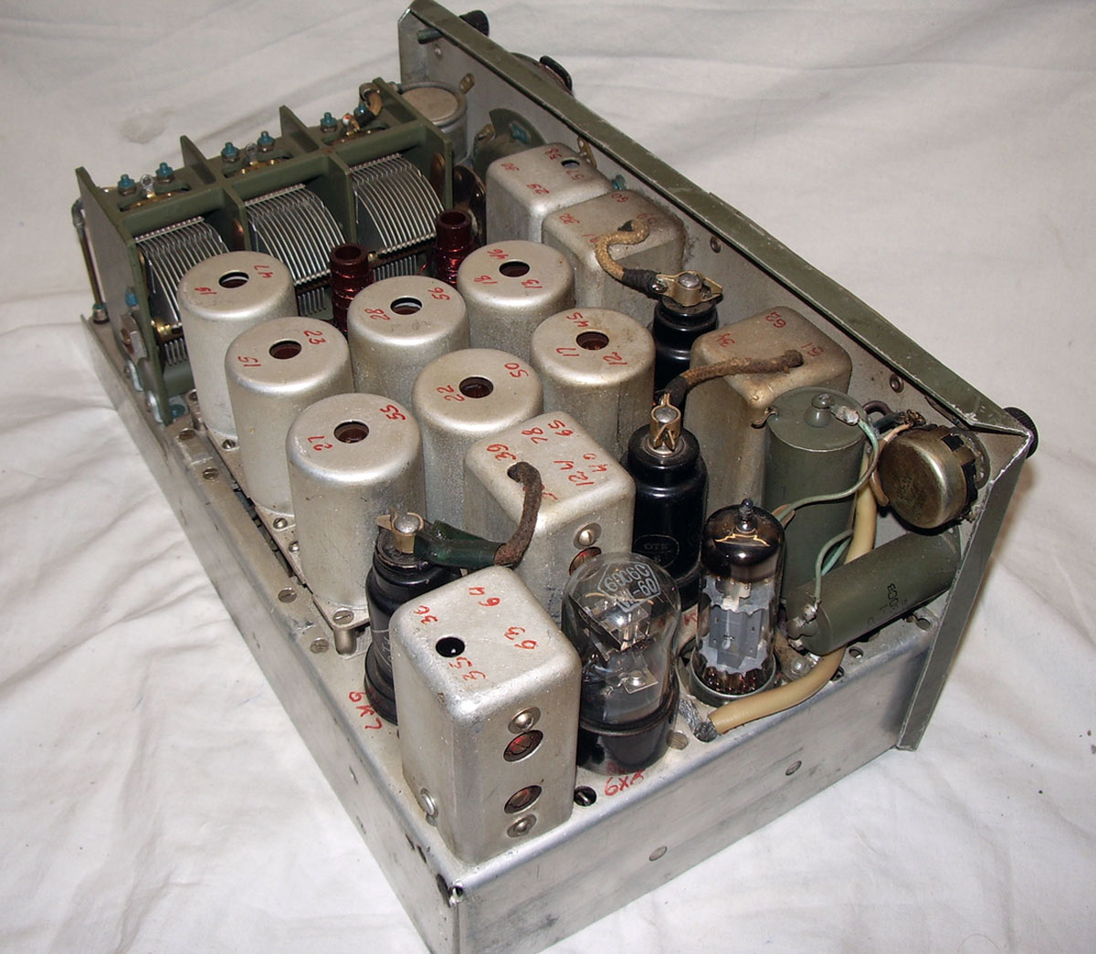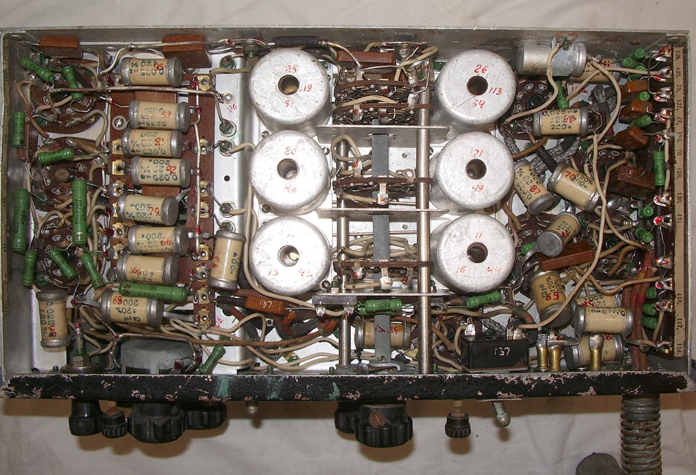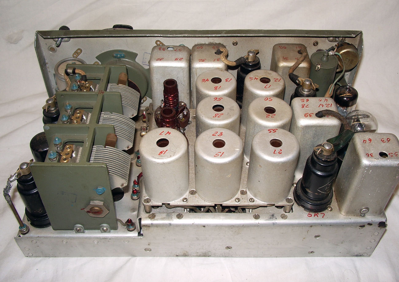 имеет каскад УВЧ на лампе 6К7, преобразователь с гетеродином на лампах