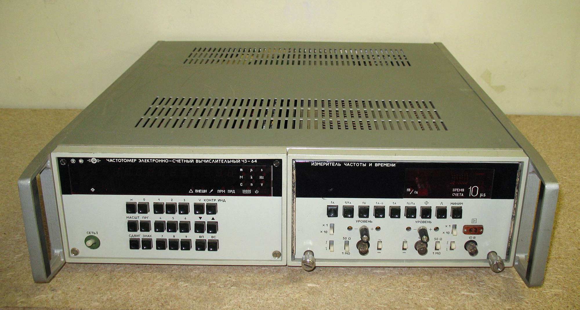 Частотомер электронно-счётный вычислительный "Ч3-64" выпускали с 1987 года. Служит для автоматического измерения импульсных и синусоидальных сигналов в диапазоне 5 Гц - 150 МГц и 100 - 1000 МГц.
