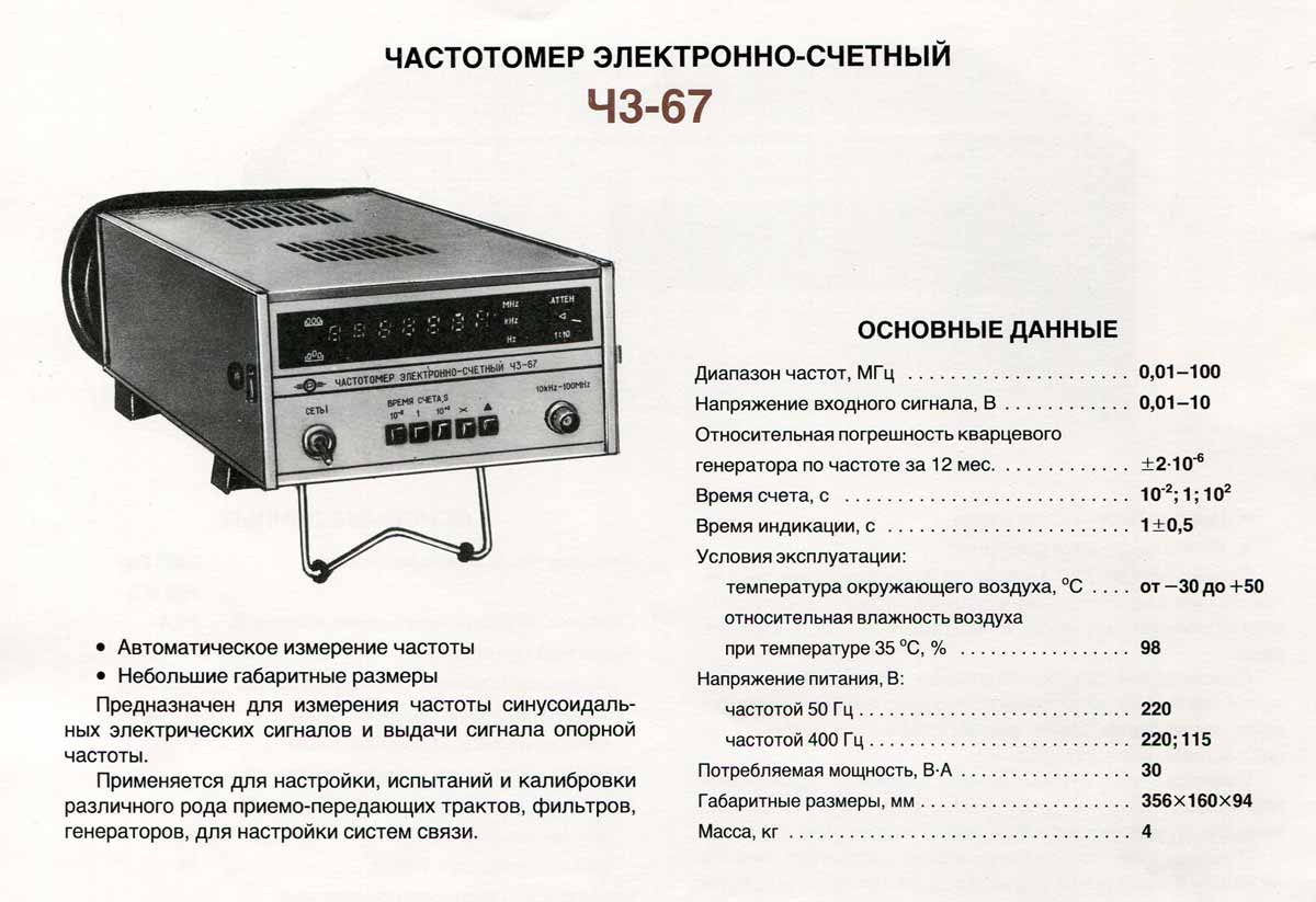 Частотомер электронно-счётный "Ч3-67" производился предположительно с 1989 года Абовянским заводом "Измеритель". Предназначен для измерения частоты до 100 МГц и выдачи сигнала опорной частоты.