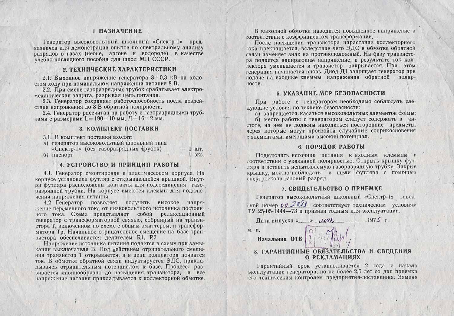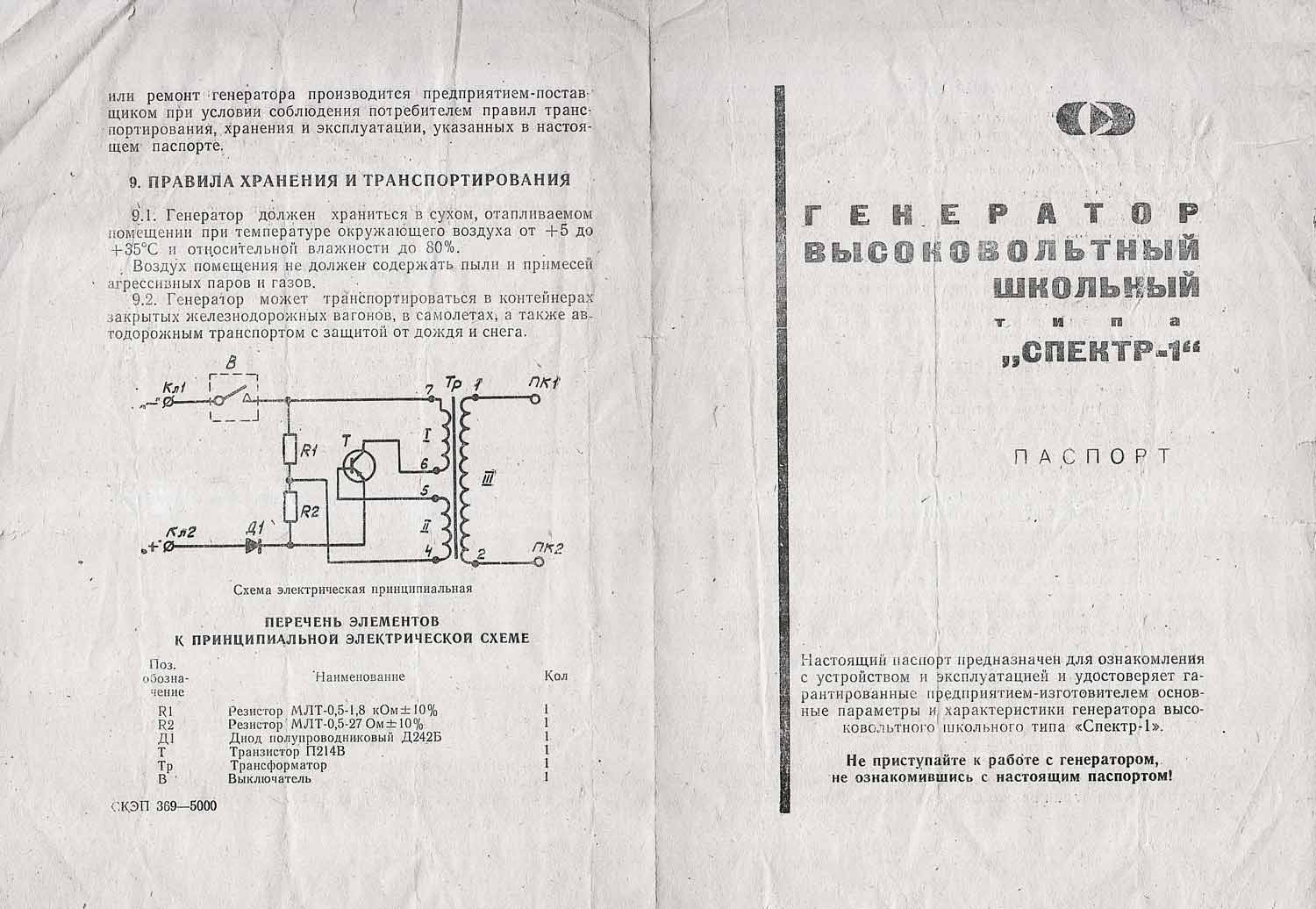Генератор высоковольтный (школьный) "Спектр-1" выпускался возможно с 1975 по 1991 годы. Служит для демонстрации опытов по спектральному анализу разрядов в газах.
