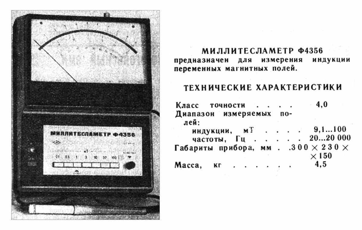Миллитесламетр "Ф4356" выпускался возможно с 1981 года Житомирским ПО "Электроизмеритель". Миллитесламетр "Ф4356" предназначен для измерения индукции магнитных полей.