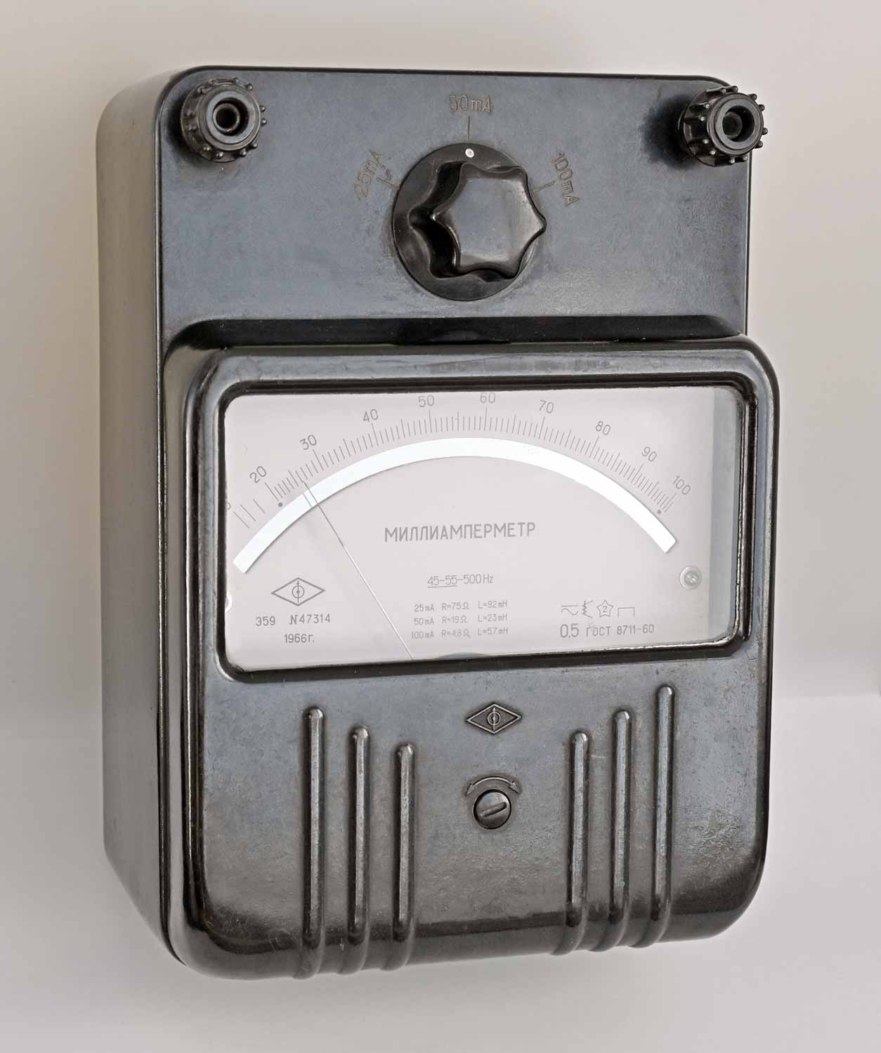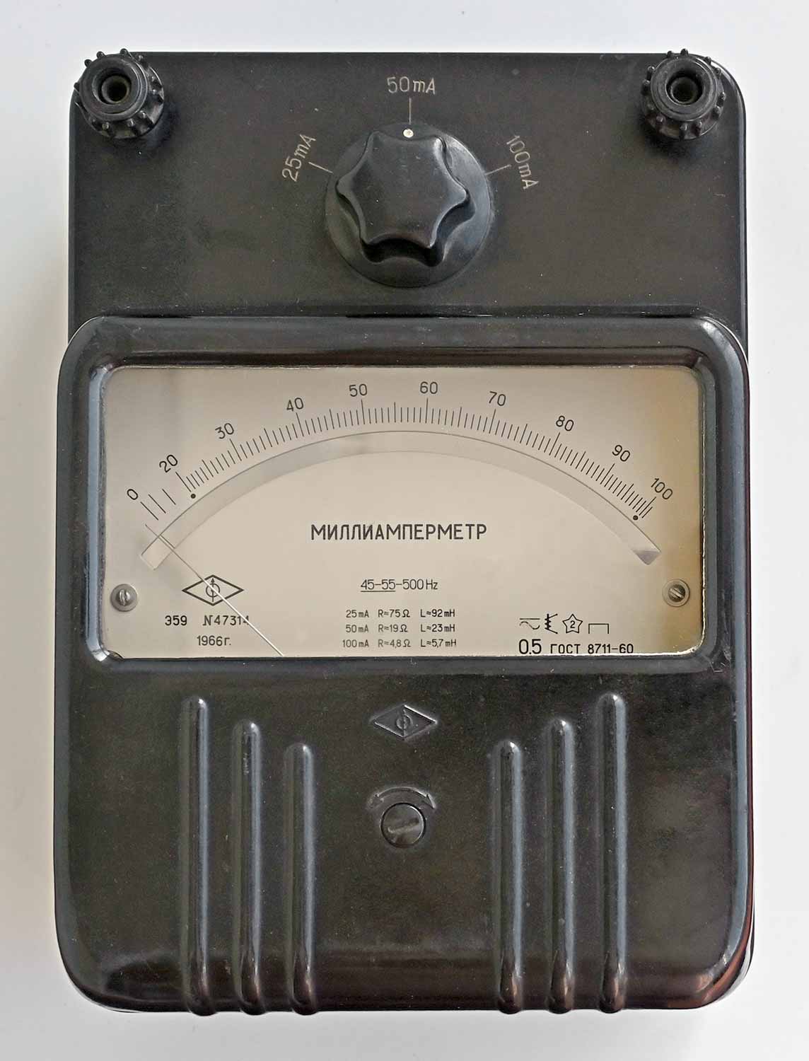 -Миллиамперметр "Э59" предположительно с 1962 года производил Киевский завод "Электроприбор". Пределы измерений 25 mA, 50 mA, 100 mA.