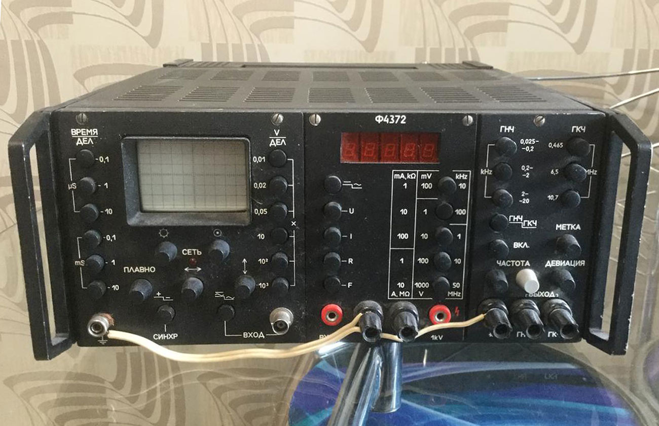 Прибор состоит из осциллографа (полоса до 10 Мгц), частотомера (до 50 МГц),