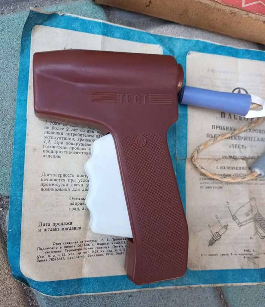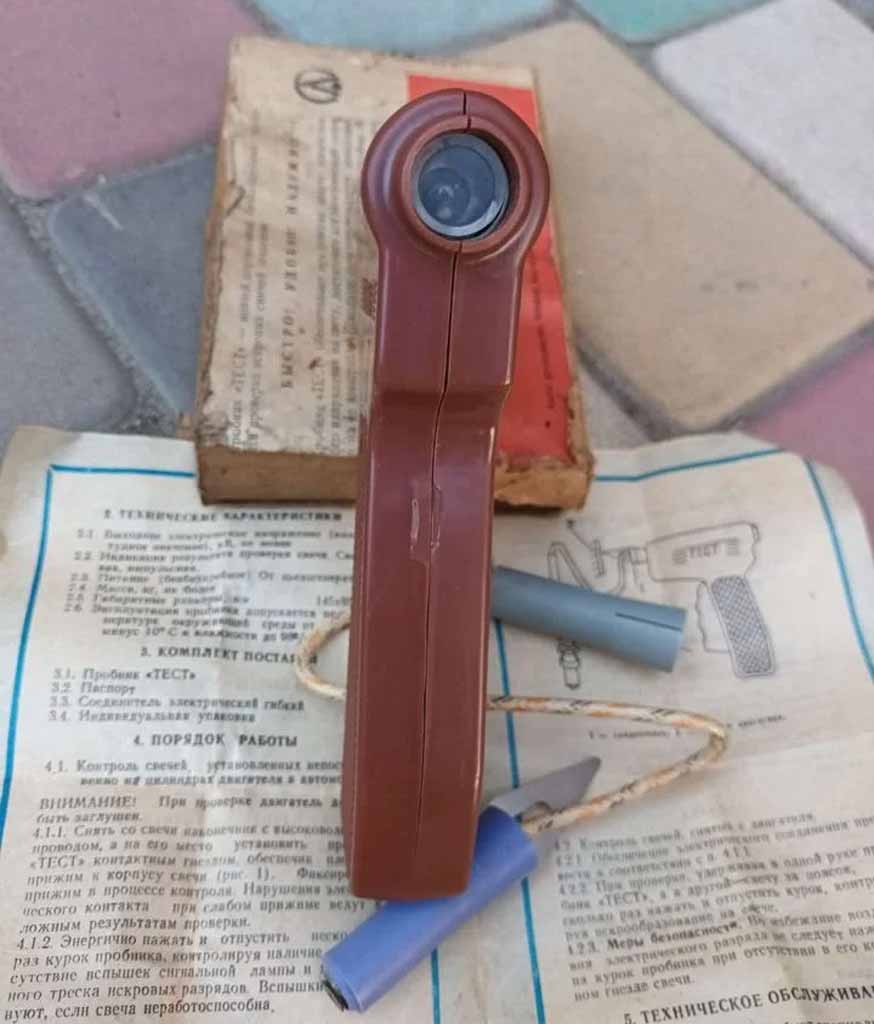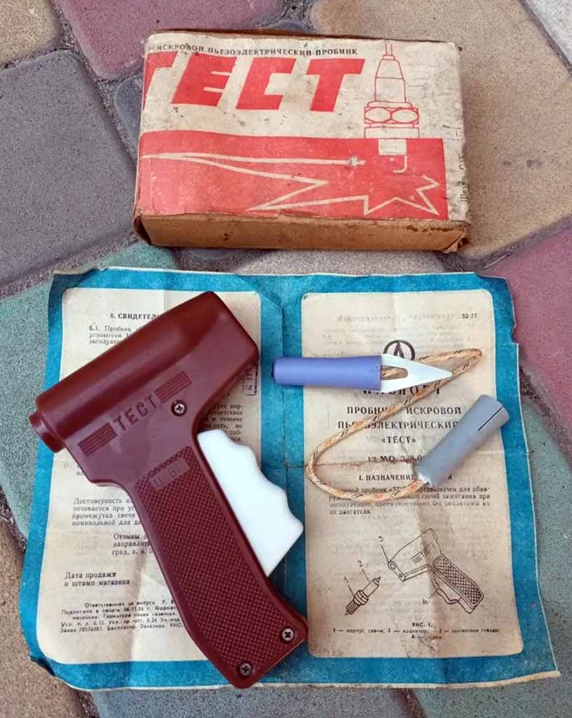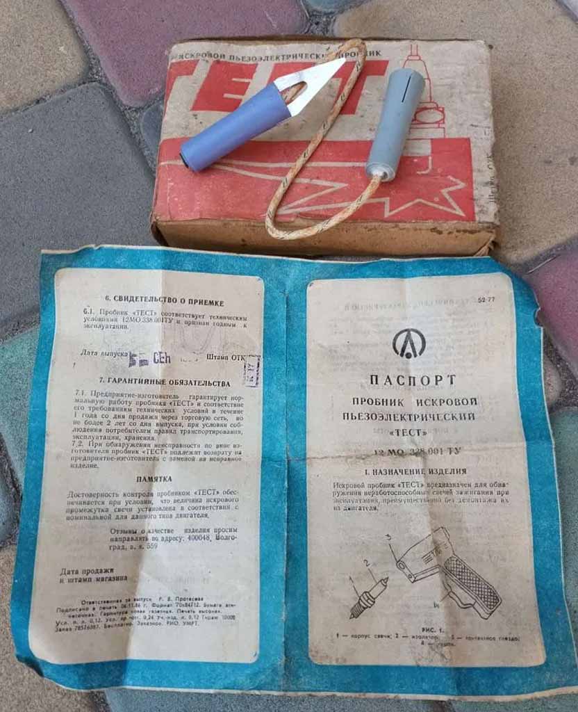 Пробник искровой пьезоэлектрический "Тест" производился с 1987 года Волгоградским заводом "Аврора". Пробник предназначен для проверки свечей зажигания в мотоциклах или в автомобилях без их снятия.