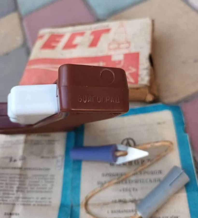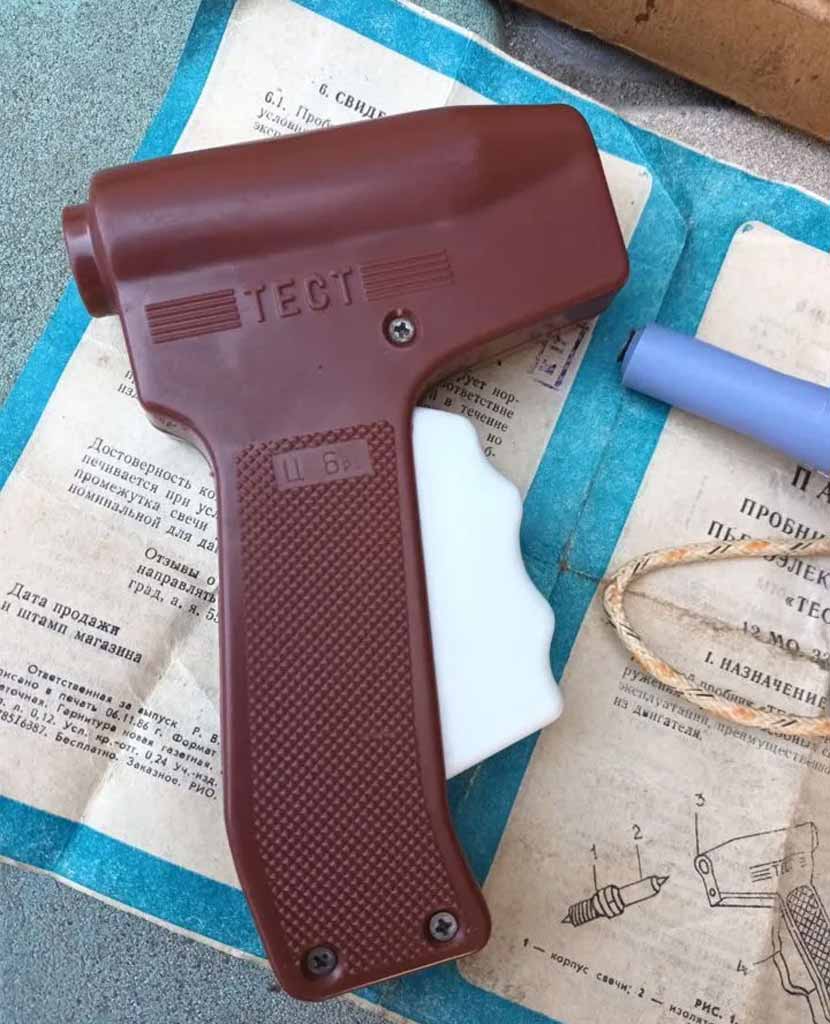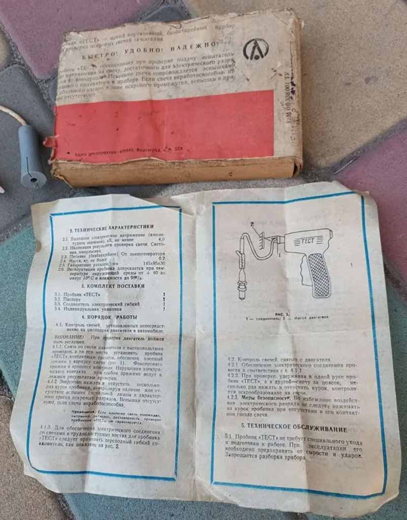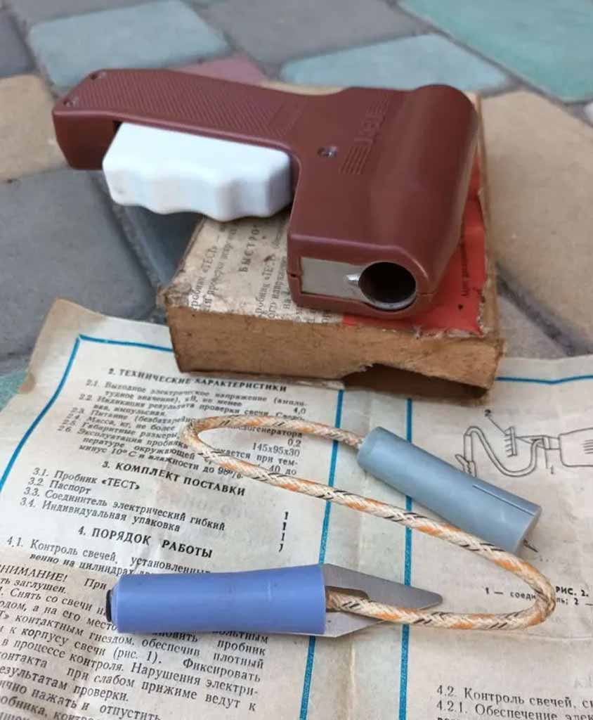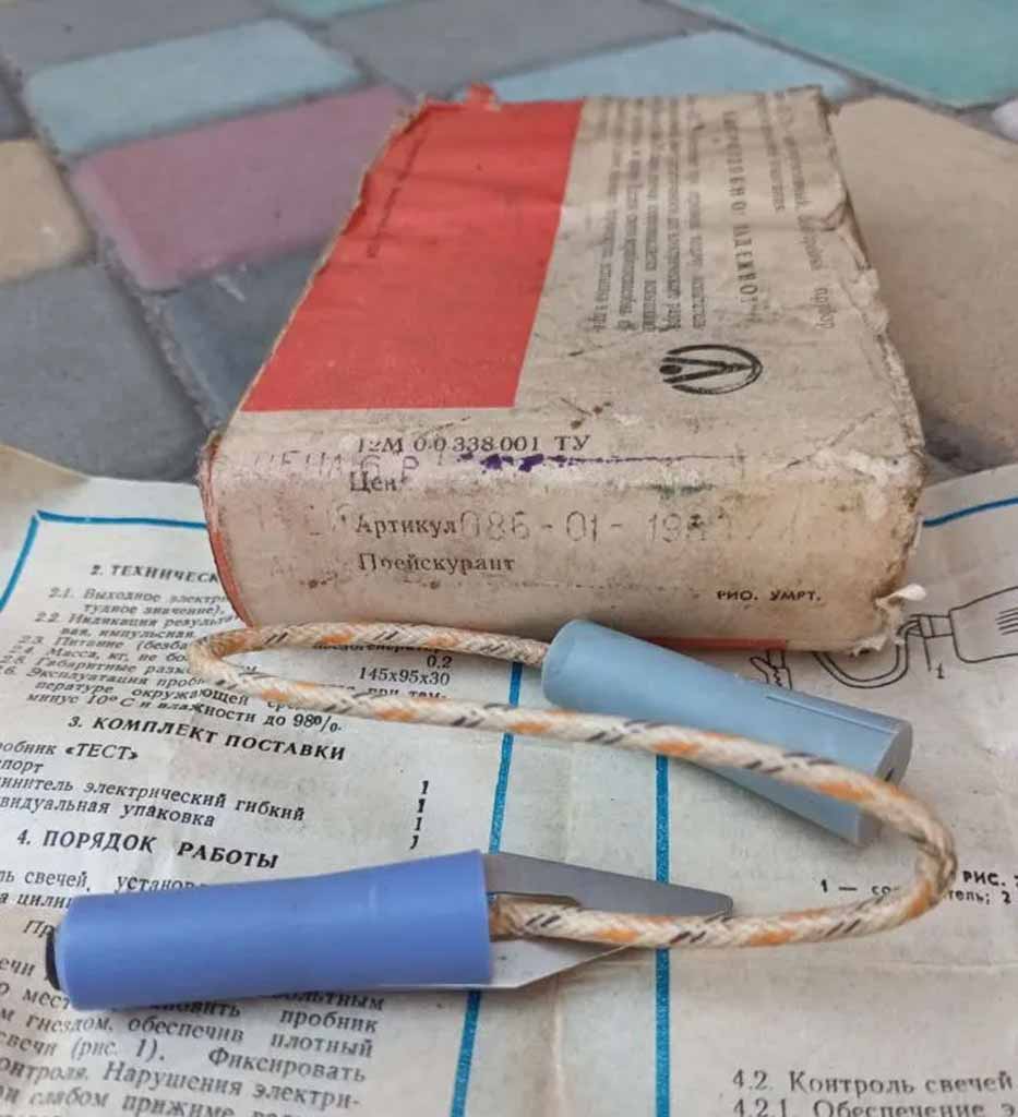 Пробник искровой пьезоэлектрический "Тест" производился с 1987 года Волгоградским заводом "Аврора". Пробник предназначен для проверки свечей зажигания в мотоциклах или в автомобилях без их снятия.