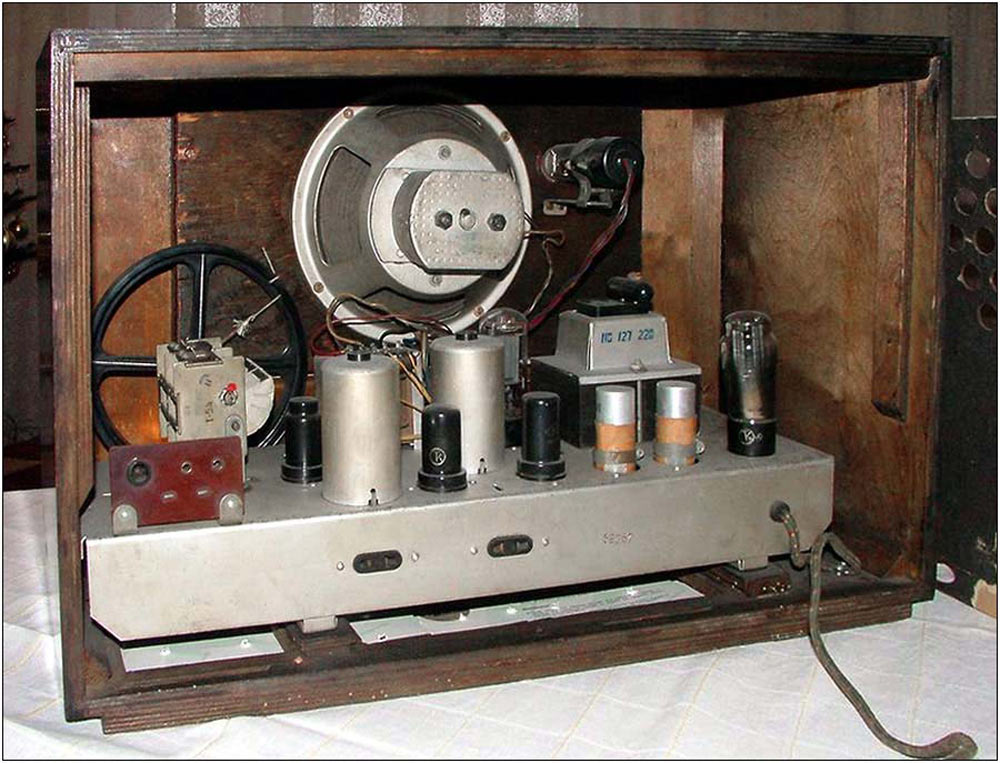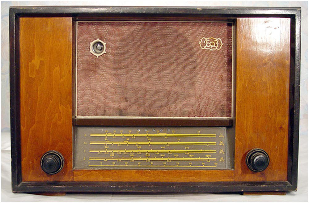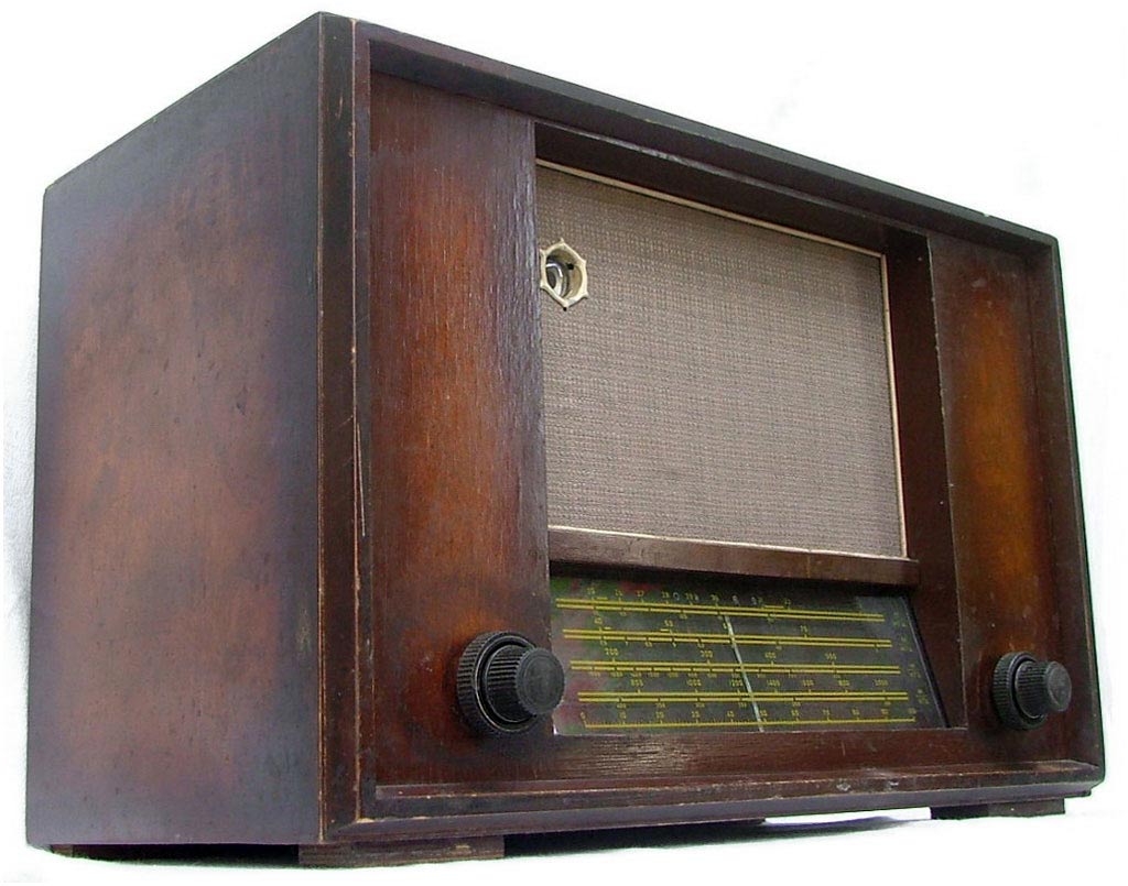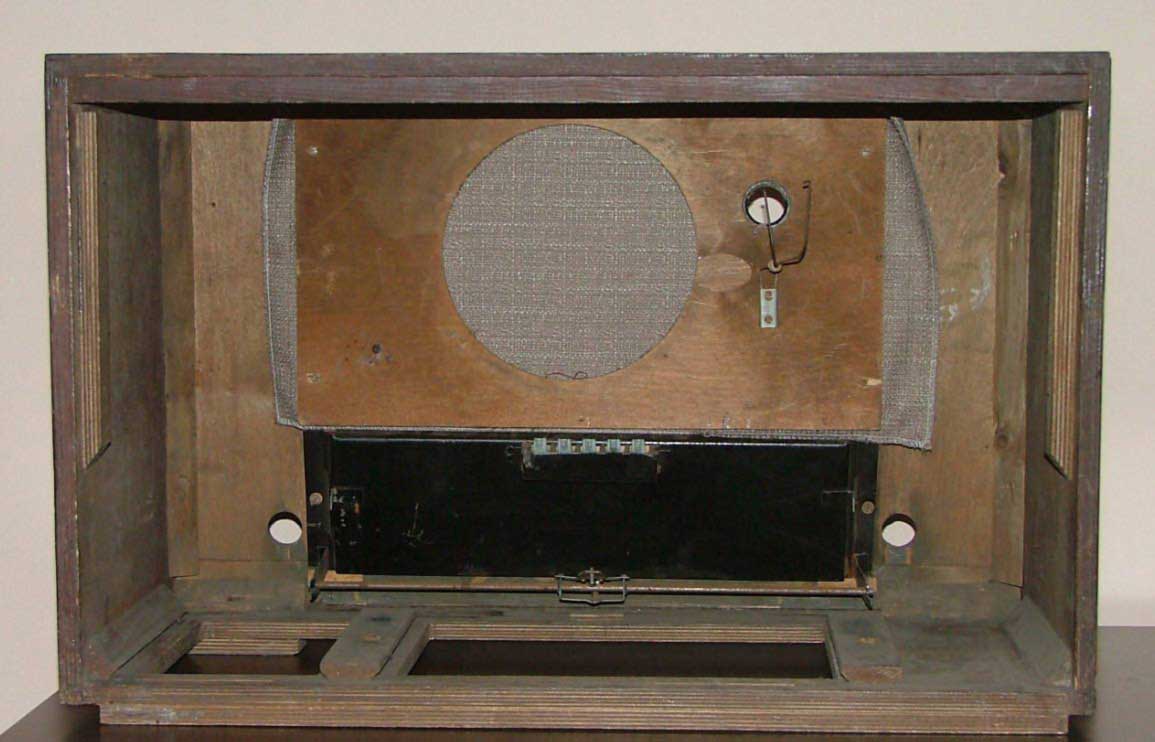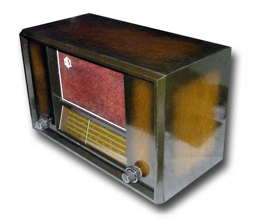 Футляр у приёмника деревянный, оклеен ореховой (берёзовой) фанерой, отполирован