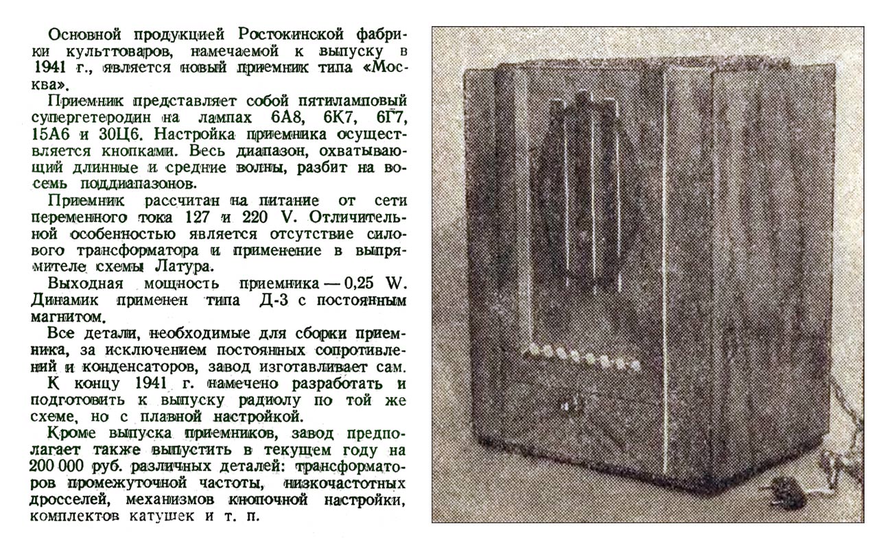 сетевой ламповый "Москва" с осени 1940 года опытной серией выпускала Фабрика