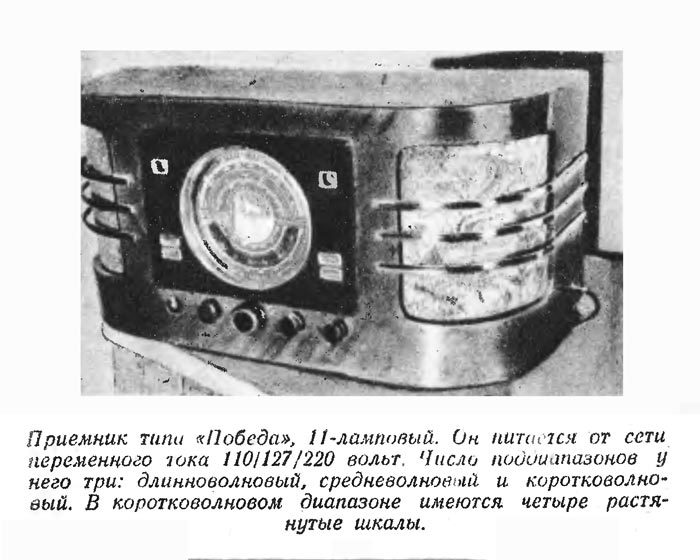 Радиоприёмник 1-го класса ''Победа'' собран на 10 радиолампах и предназначен