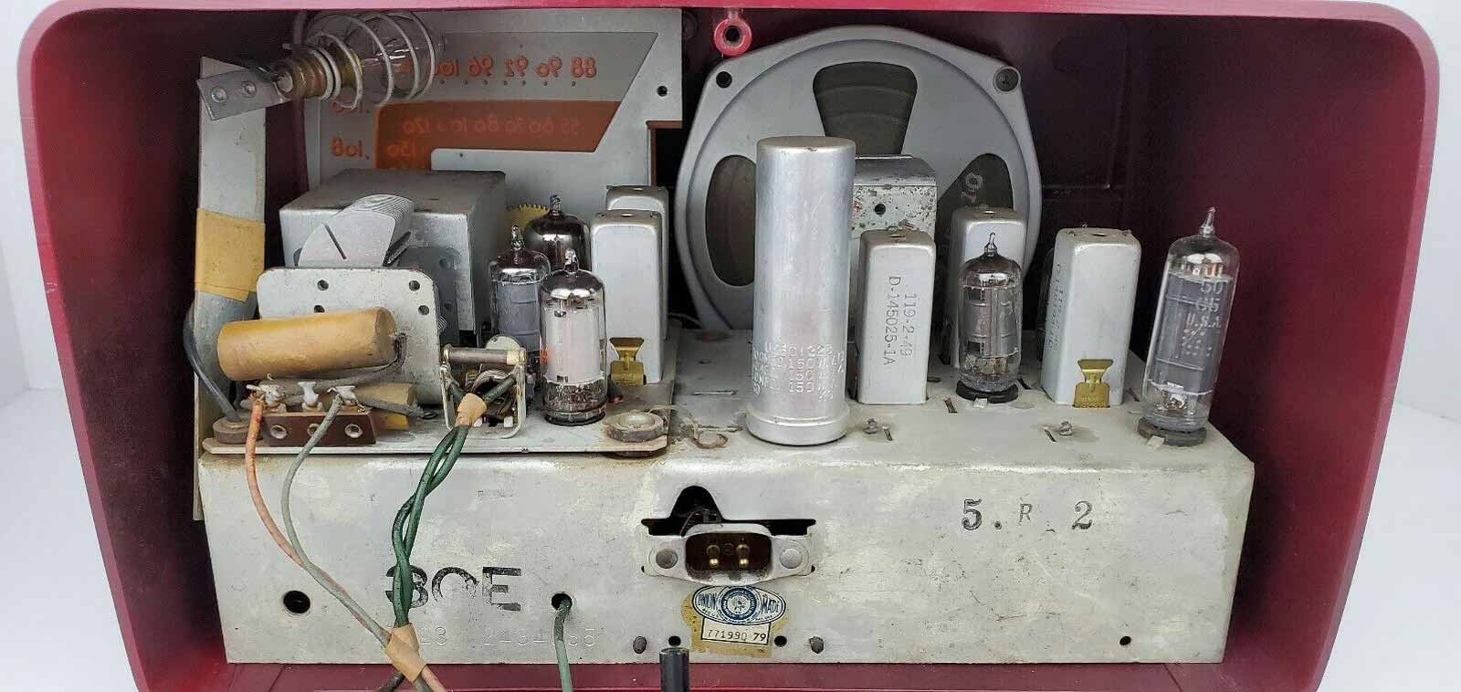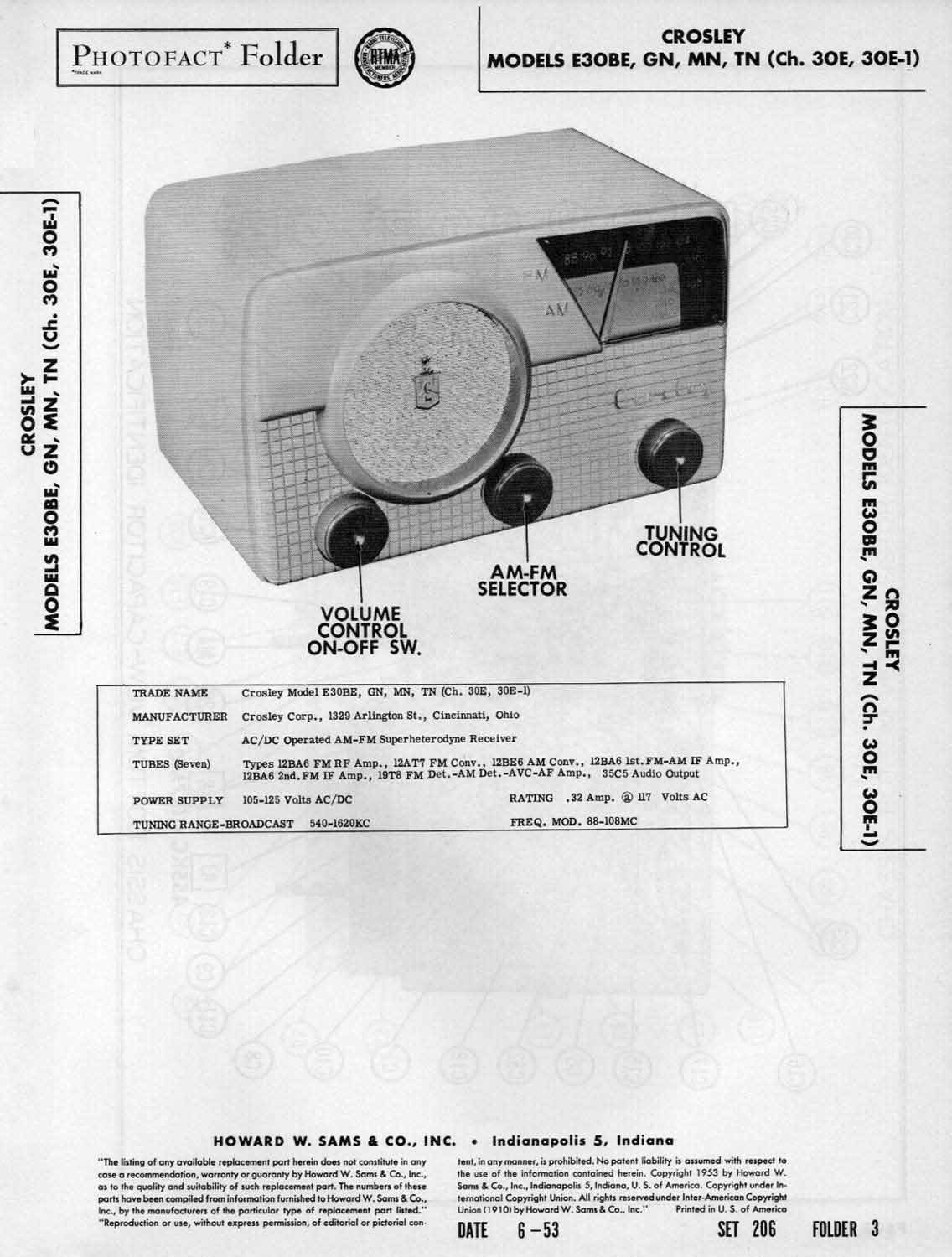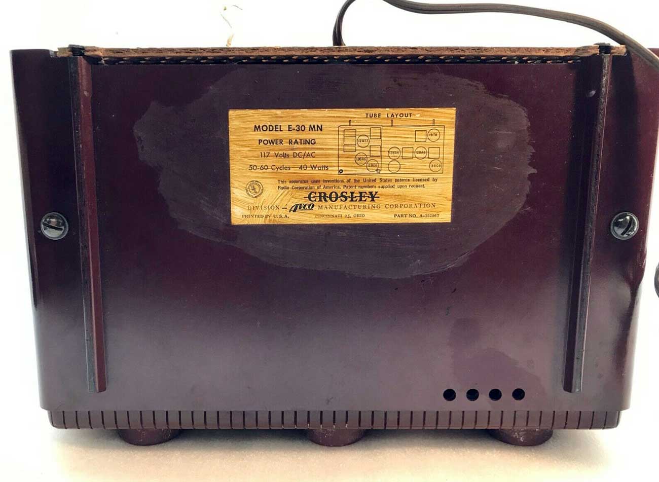 Радиоприёмник "Crosley E-30" выпускался с 1953 года корпорацией "Crosley". Супер на 7 лампах. АМ 540...1620 кГц, FM 88...108 МГц. ПЧ АМ 452 кГц. Питание - сеть постоянного или переменного тока 105...125 В.