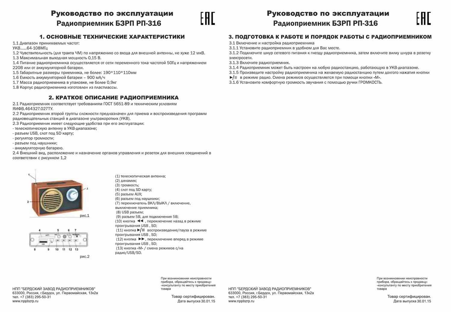 УКВ радиоприёмник "БЗРП РП-316" возможно с 2015 года выпускал НПП "Бердский завод радиоприёмников. Диапазон 64...108 МГц. Воспроизведение MP-3. Пульт ДУ. Видеосюжет.