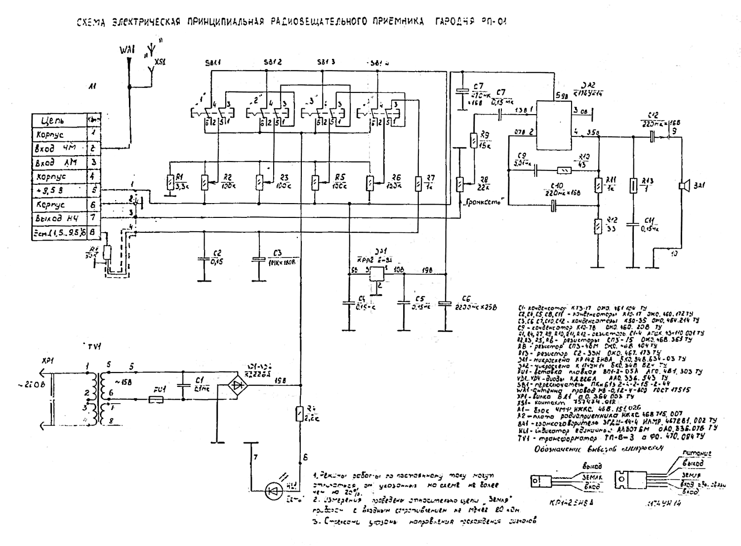 150...10000 Гц. Питание от сети 220 В. Электрическая схема приёмника и