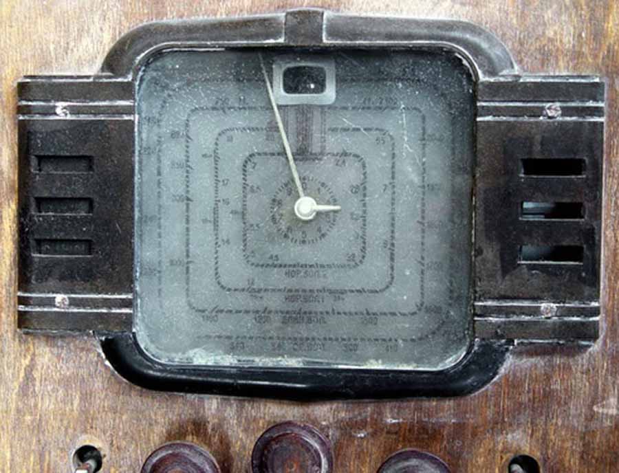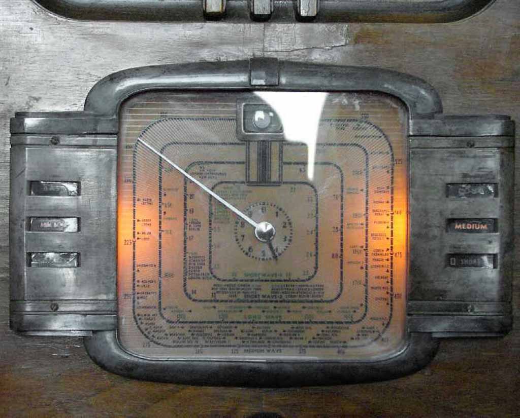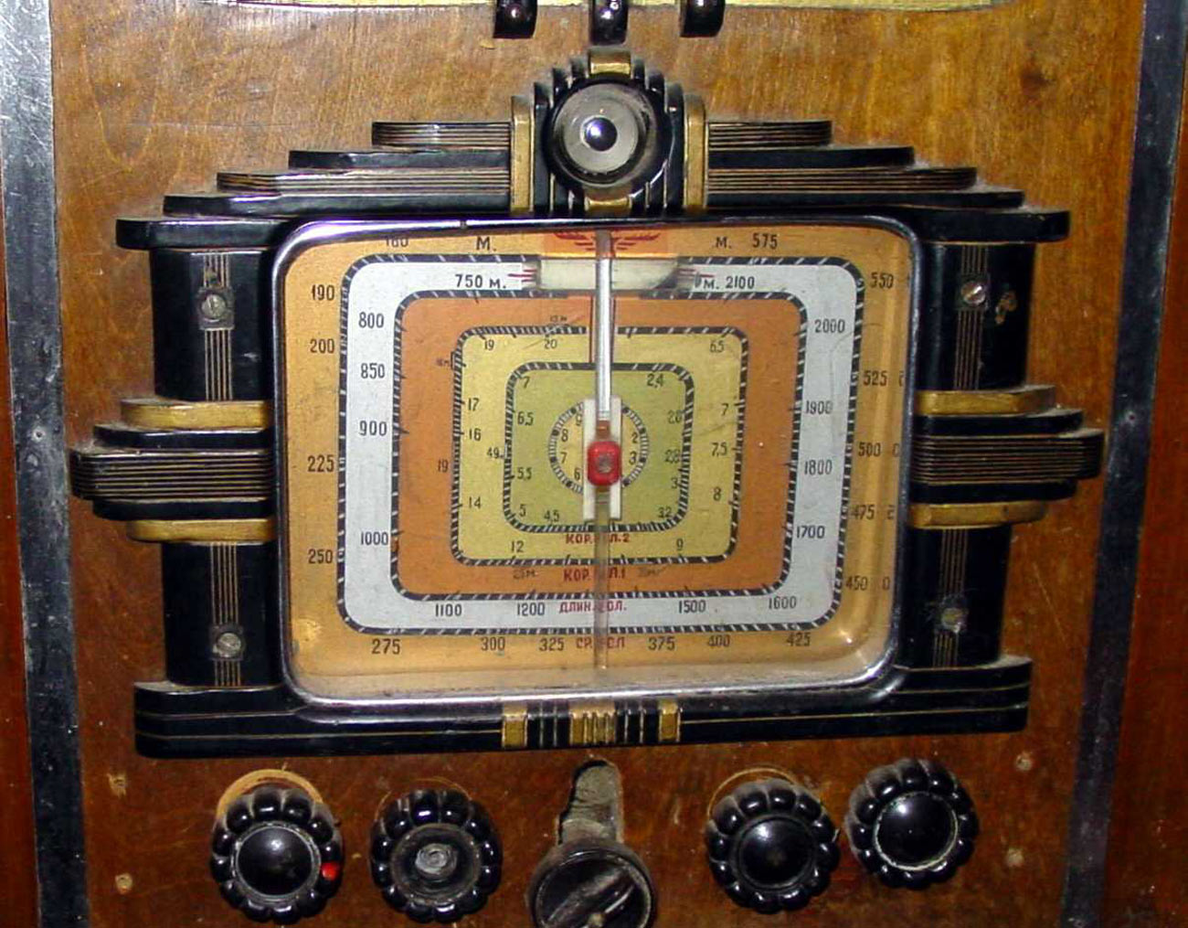 радиола "Победа" имеет множество хромированных элементов перед шкалой,