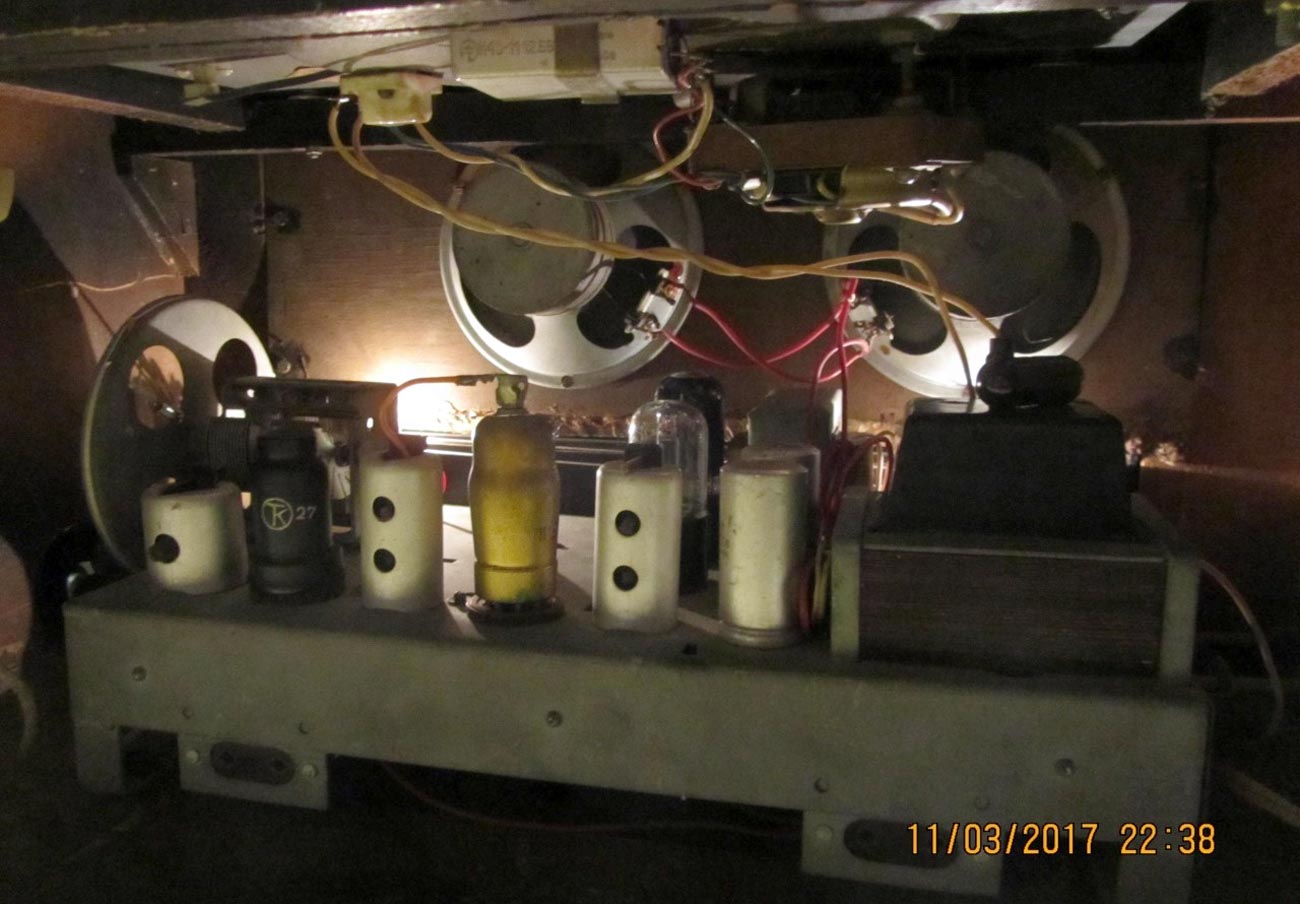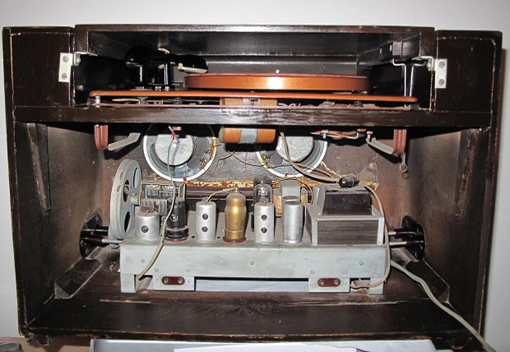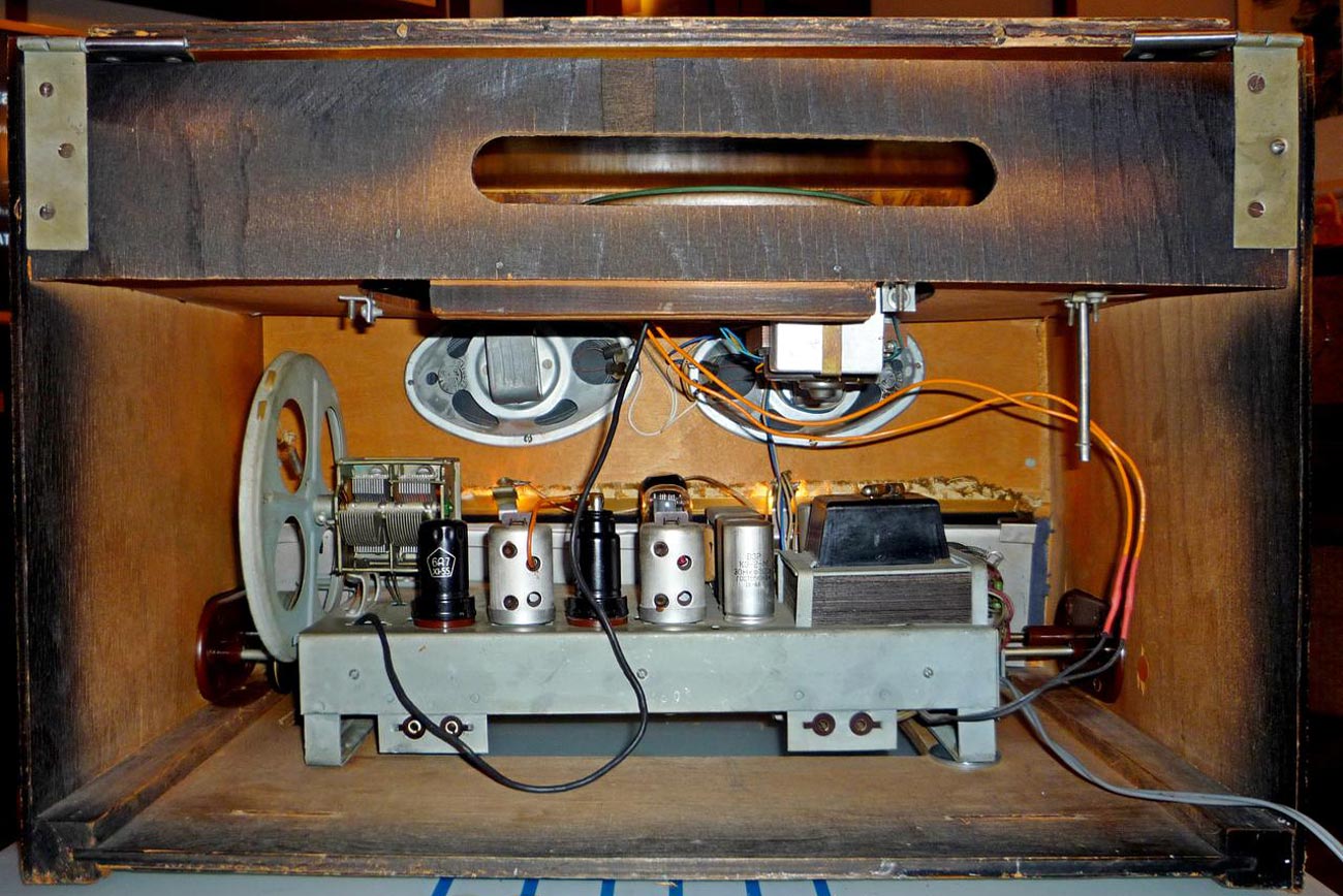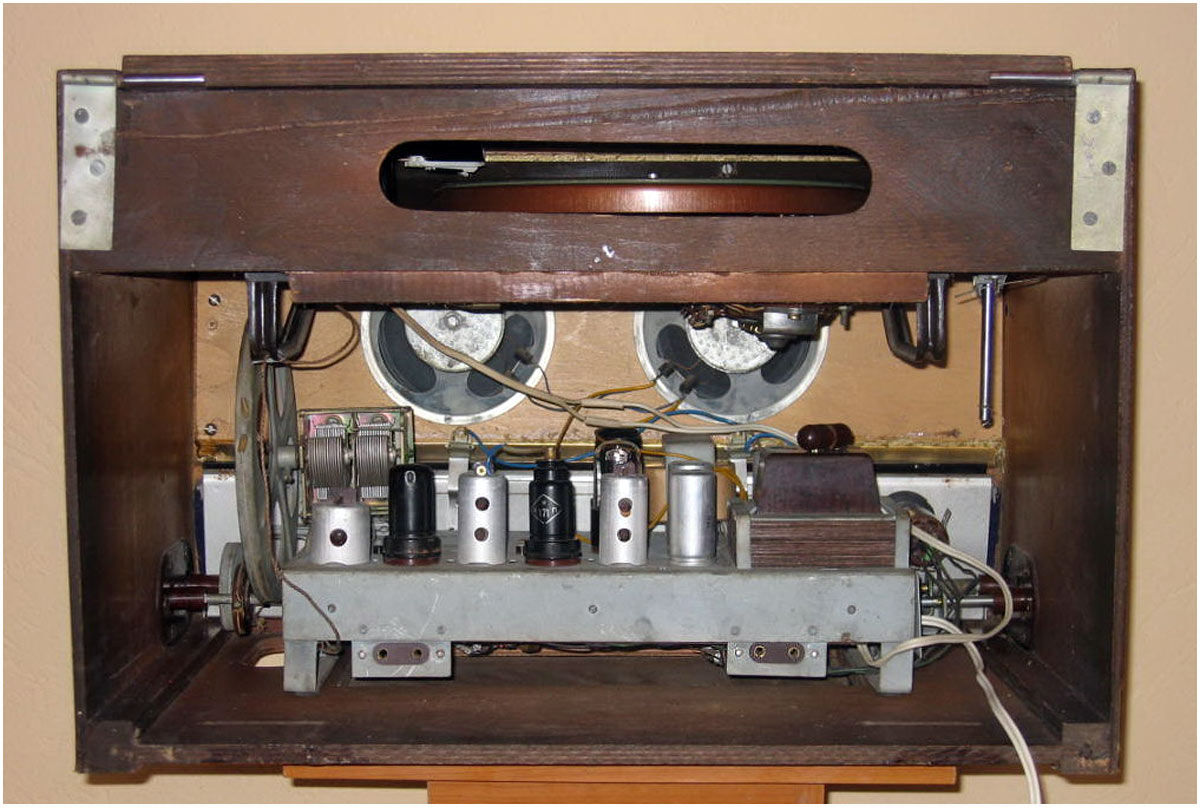 состоит из 6-ти лампового; 6А7, 6Б8С, 6Н9С, 6П6С, 6Е5С и 6Ц5С радиоприёмника
