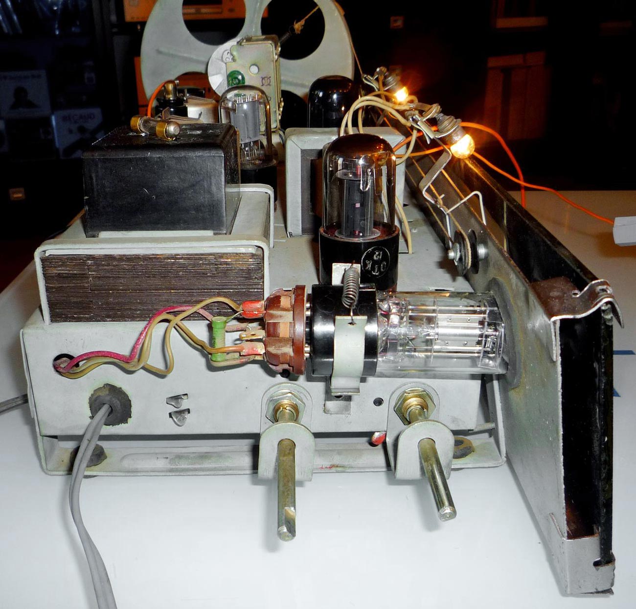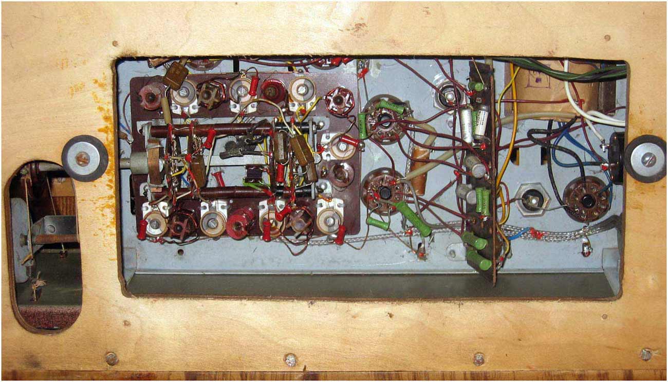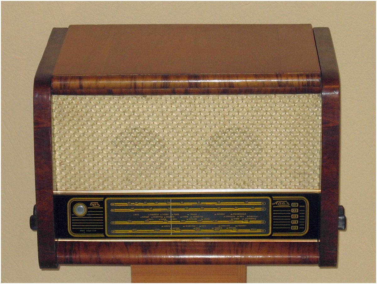 состоит из 6-ти лампового; 6А7, 6Б8С, 6Н9С, 6П6С, 6Е5С и 6Ц5С радиоприёмника