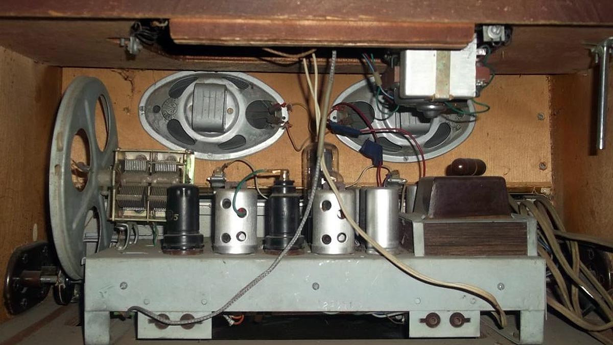 в акустической системе, электрическая схема и конструкция радиолы почти