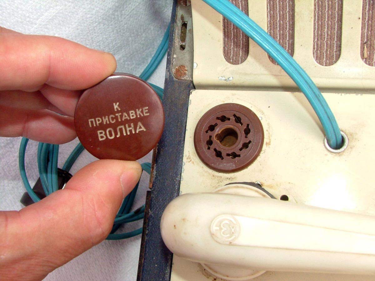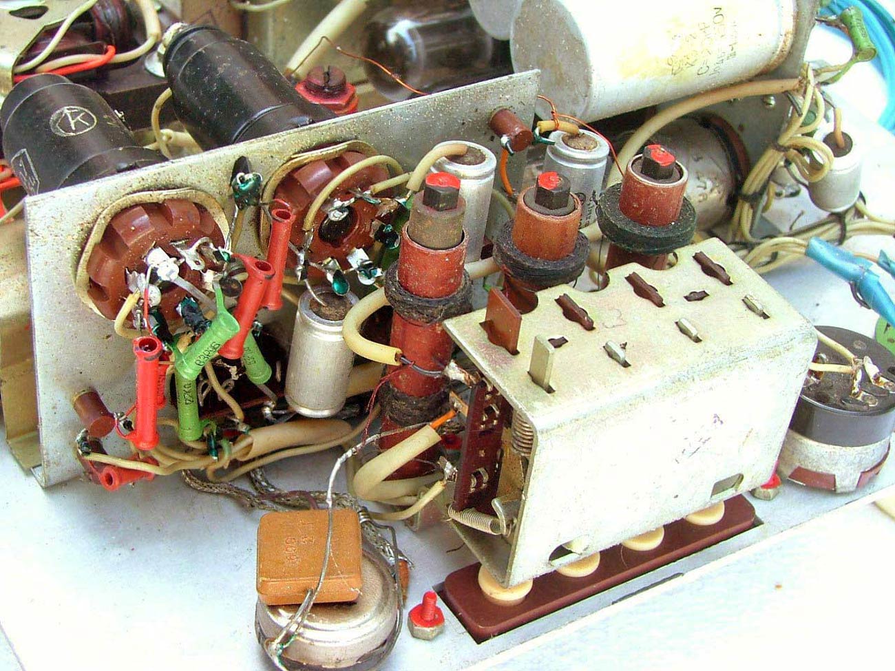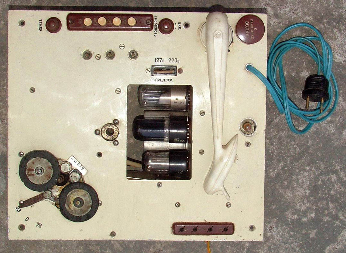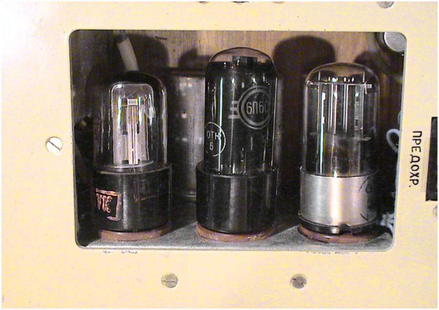 на лампах 6А7, 6Б8С, 6Н9С, 6П6С, в выпрямителе работает лампа 6Ц5С. В качестве
