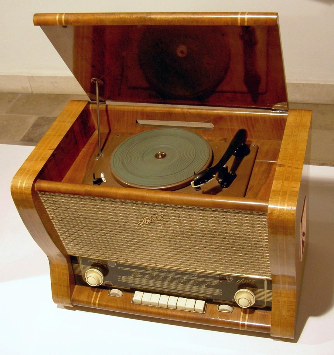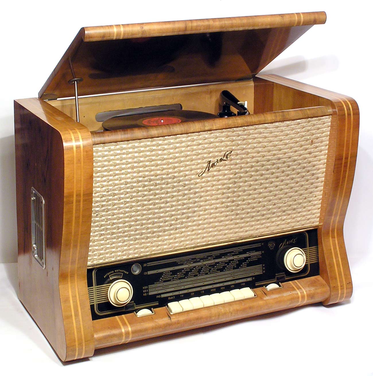 имеет пьезокерамический звукосниматель. Корпус радиолы отделан под ценные