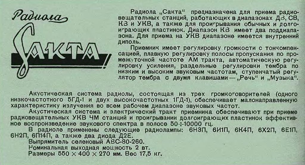 сетевая ламповая ''Сакта'' с 1959 года выпускалась Рижским радиозаводом
