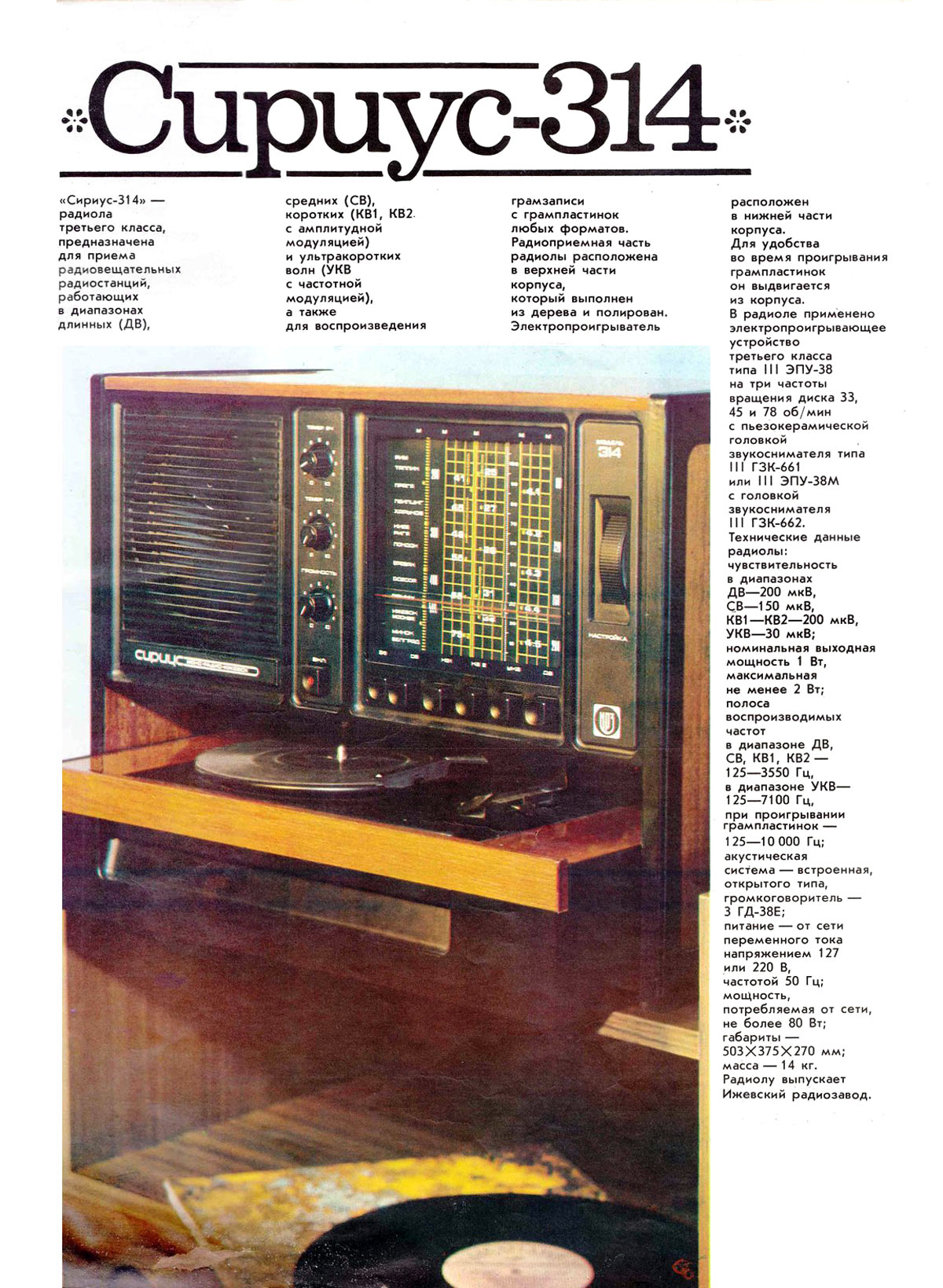 Ламповая радиола третьего класса "Сириус-314" с 1979 года опытно выпущена Ижевским радиозаводом. Подробное описание радиолы в рекламном проспекте.