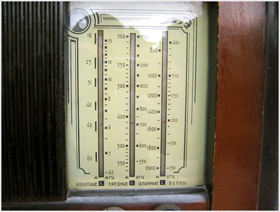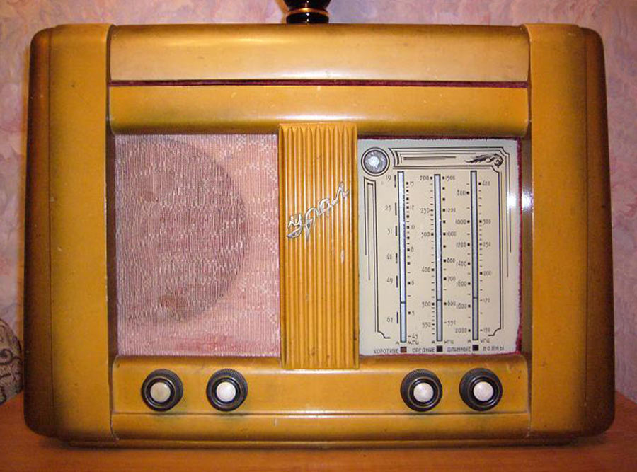 логотипом УРЗ (Уральский Радио Завод) и чёрной шкалой, а вверху около индикатора