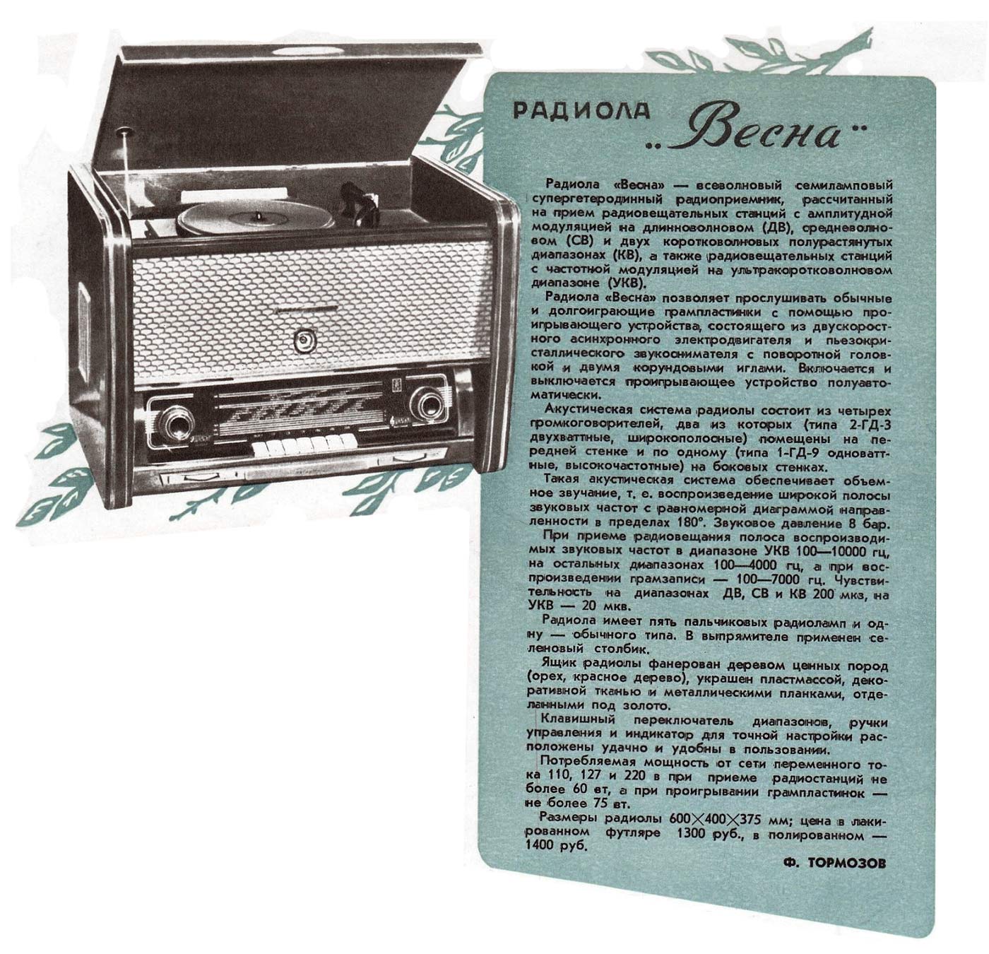 Сетевая ламповая радиола "Весна" подготовлена к выпуску с 1958 года Муромским заводом РИП. Информация из журнала "Новые товары" № 4 за 1958 год.