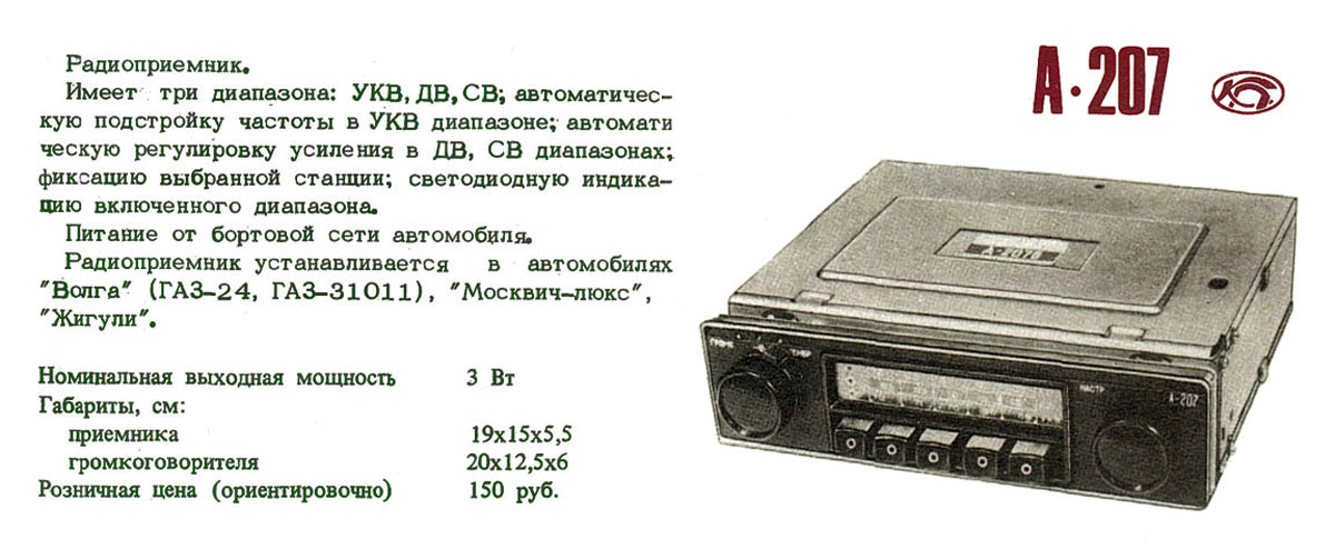 Радиоприёмник автомобильный ''А-207/В'' выпускался с 1984 года Калужским заводом "Калугаприбор". Модель является аналогом радиоприёмника "Былина-207/В" Муромского радиозавода.