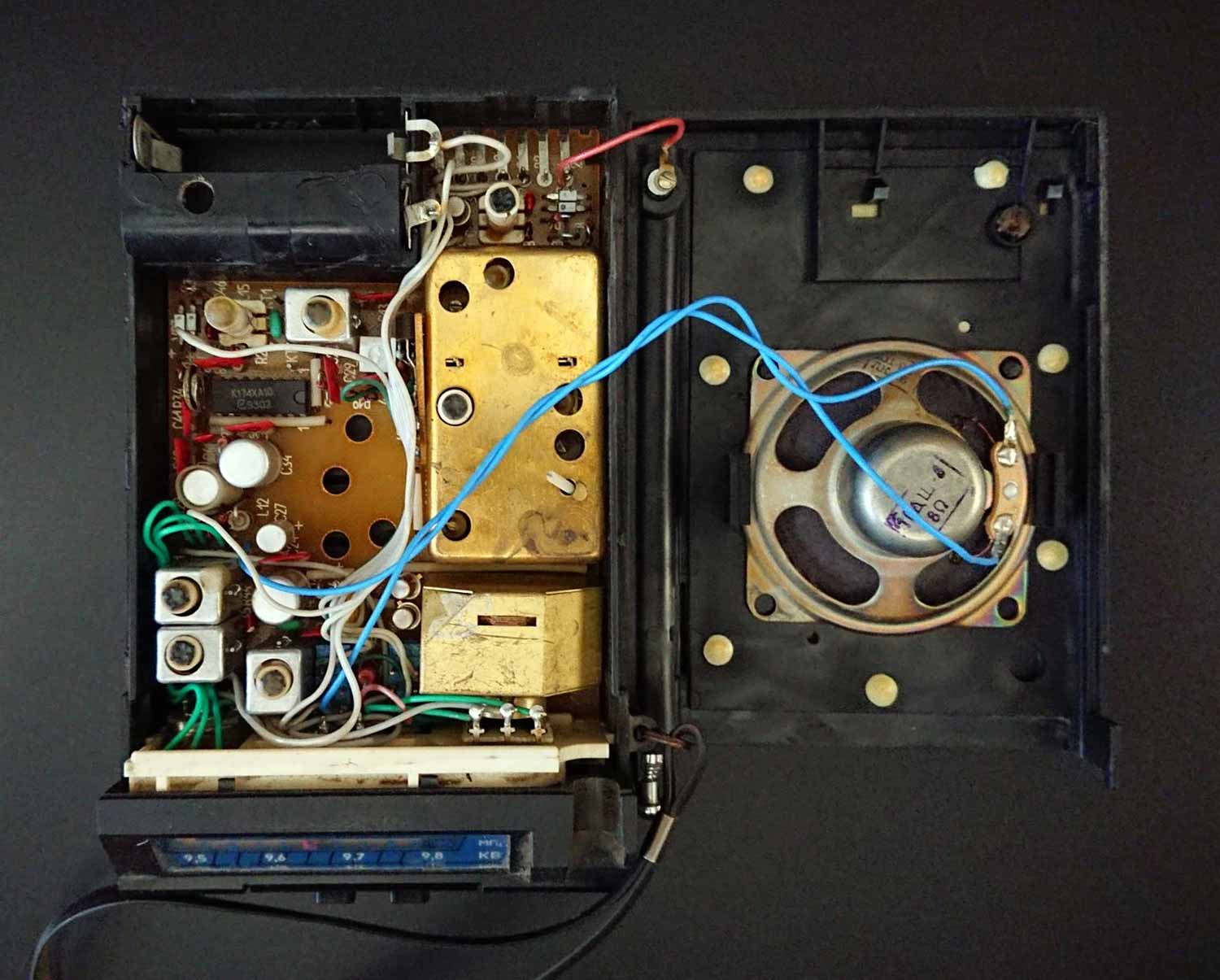 вмонтированная в корпус динамическая головка. Питается приёмник в этом