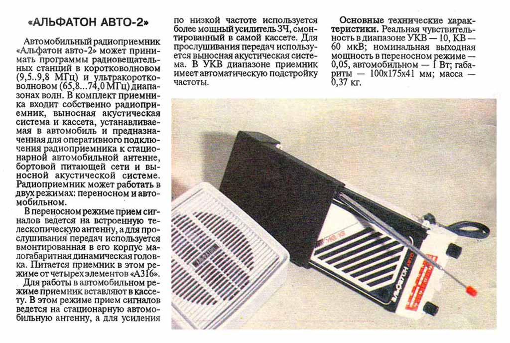 Описание радиоприёмника "Альфатон-авто-2" в журнале
