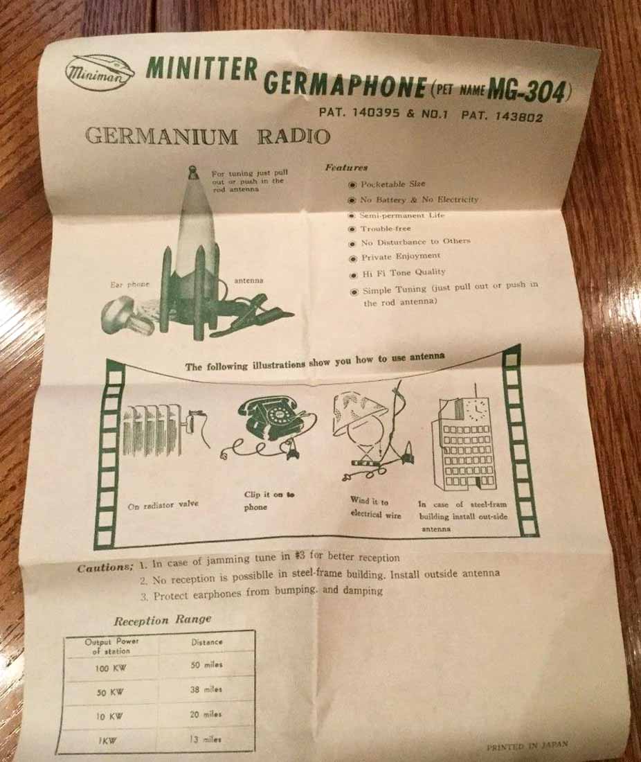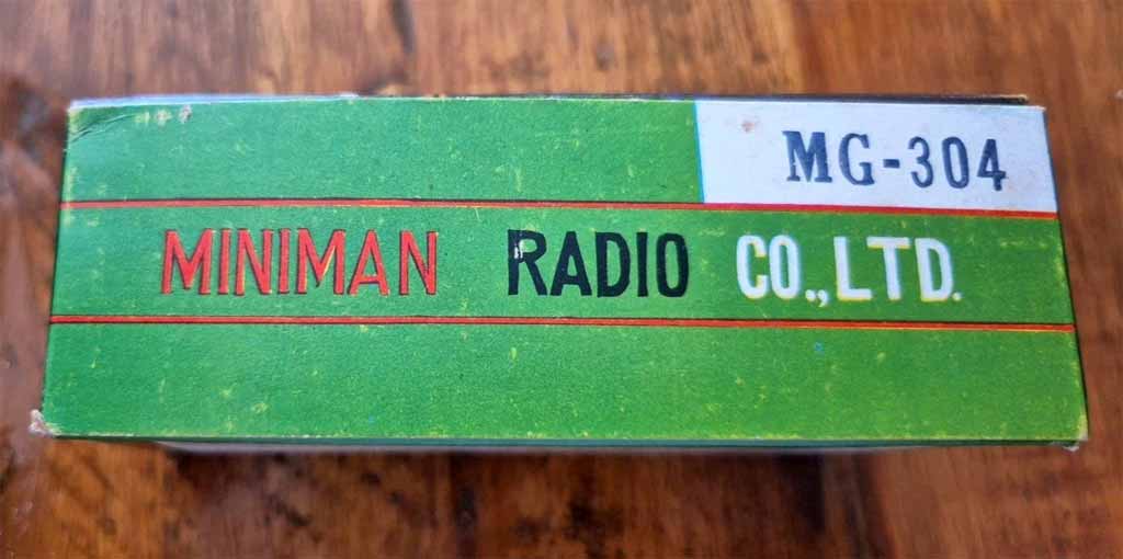 Детекторный радиоприёмник "Miniman MG-304" выпускался возможно с 1960 года компанией Miniman в Японии. Детский или как сувенирный радиоприёмник на диапазон средних волн (СВ). Не требует питания.