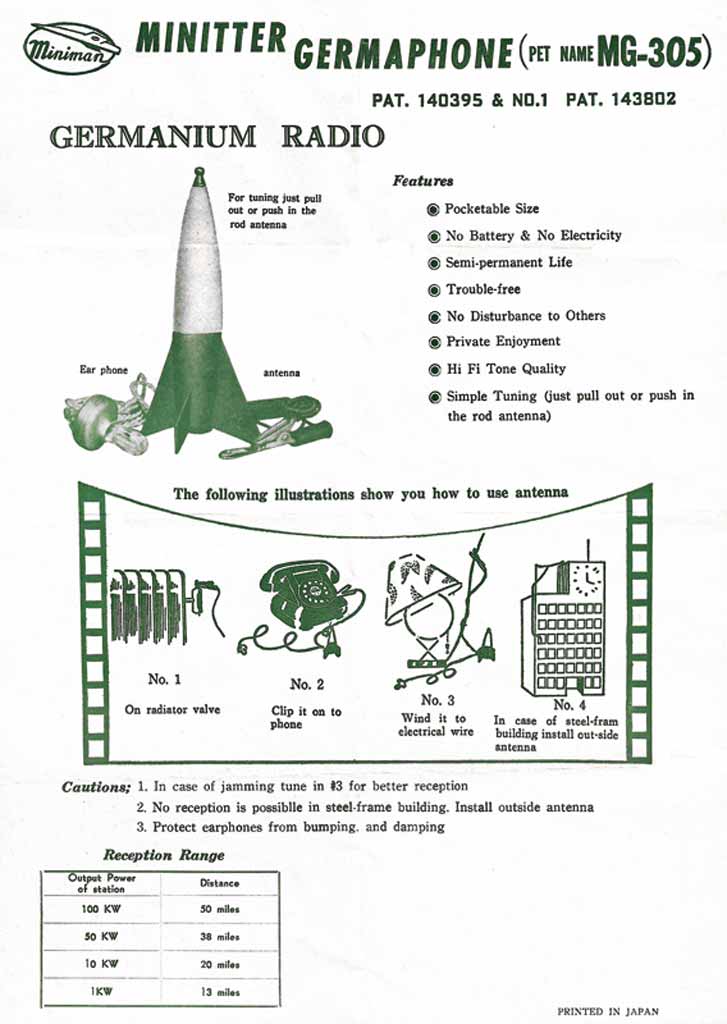 Детекторный радиоприёмник "Miniman Minitter MG-305" выпускался возможно с 1962 года компанией Miniman Radio Co., LTD. Япония.