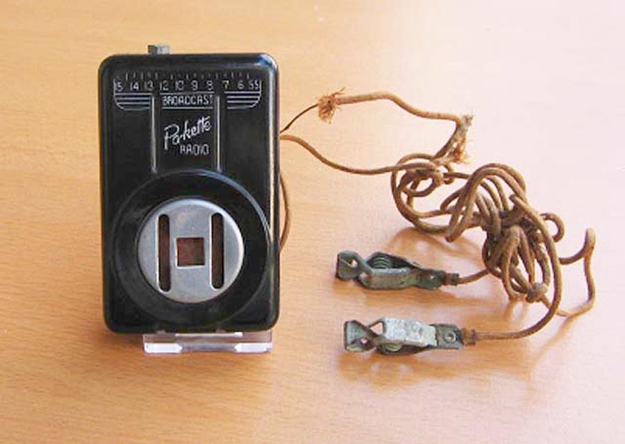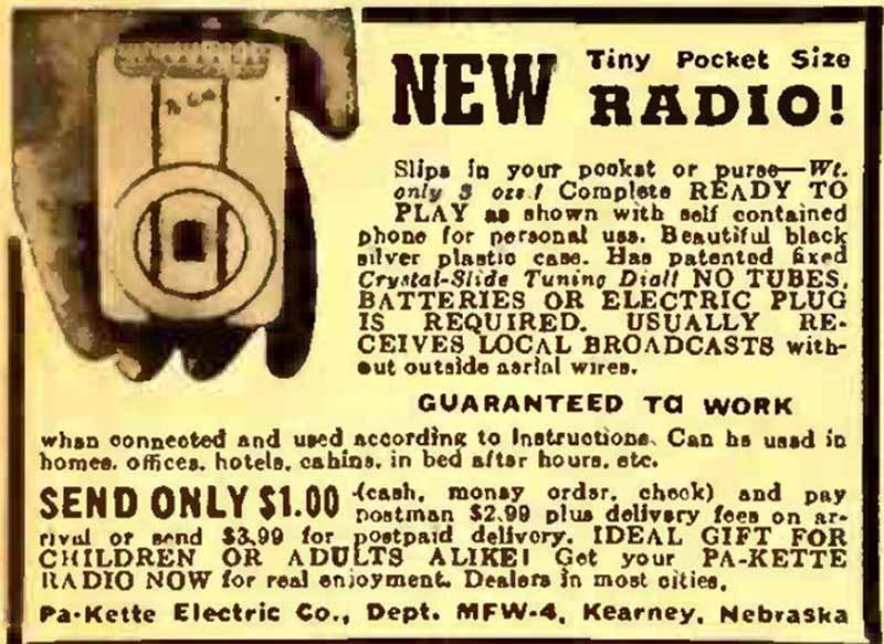 Портативный детекторный радиоприёмник "Pa-Kette" выпускался с 1946 года компанией "Кирни", Небраска, США. Диапазон СВ - 550...1500 метров. Габариты - 83х51x25 мм. Масса 210 гр.