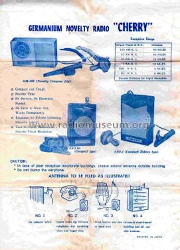 Детекторный радиоприёмник "Cherry GM-100" выпускался возможно с 1956 года в Японии. Детский радиоприёмник на диапазон средних волн. Ссылка на фото.