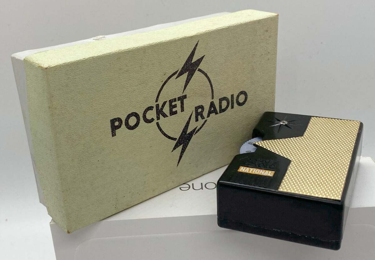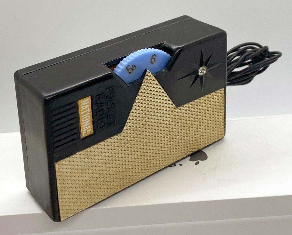 Карманный детекторный радиоприёмник "National" выпускался возможно с 1958 года компанией "Matsushita Electric Industrial", Япония. Позволял принимать радиостанции в СВ диапазоне, удалённые до 50 км.