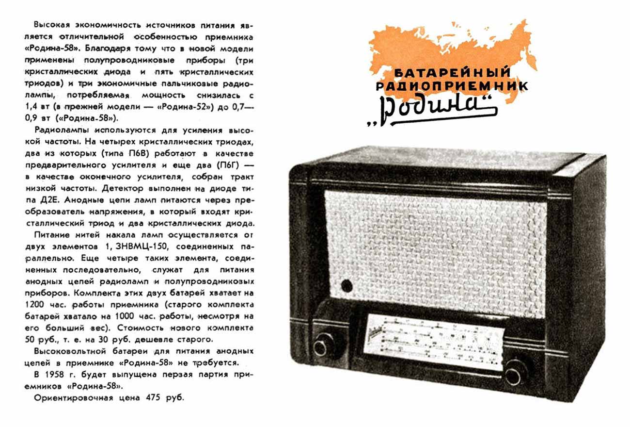 на лампах, по конструкции и схеме приёмника "Родина-52М". С осени 1958